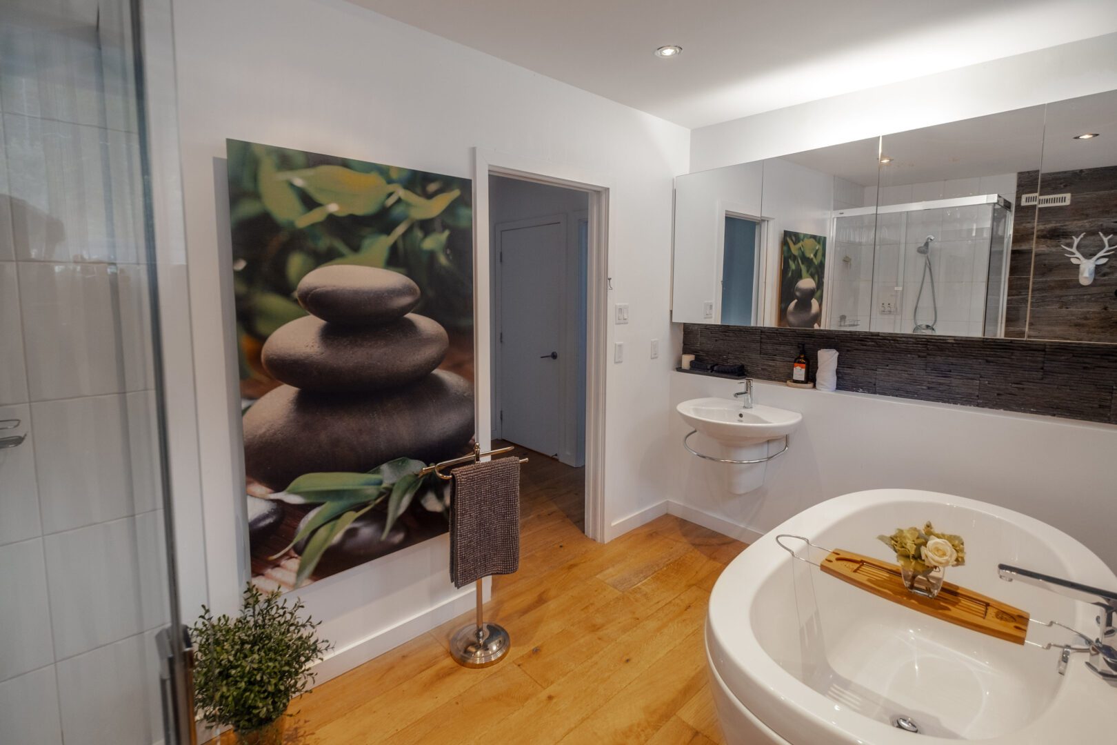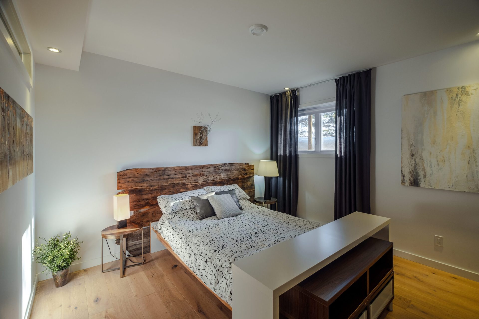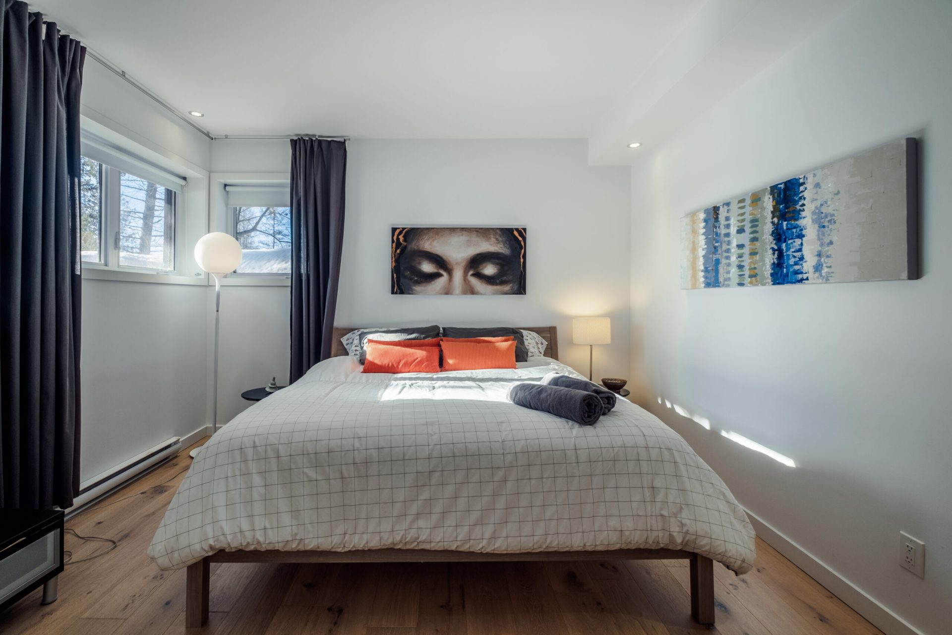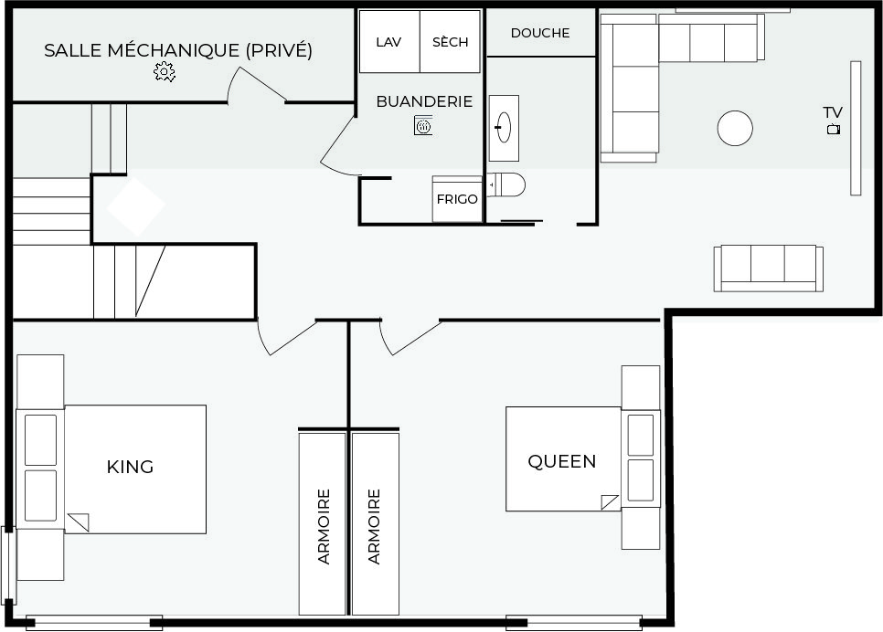 Au niveau rez-de-jardin, vous trouverez deux chambres spacieuses équipées de matelas et de literie qualité hôtel (1 chambre avec lit King + 1 chambre avec lit Queen) et une salle de bain avec douche en verre. Au fond du couloir, une salle de cinéma maison avec écran 60 », système de son et Blu-Ray/DVD à disposition sera parfaite pour les longues soirées d’hiver. Notez que le chalet dispose d’un deuxième frigo au sous-sol, de deux lits (parcs) pour bébés et de 2 réhausseurs de siège. Un espace buanderie avec laveuse et sécheuse est disponible au niveau rez-de-jardin.