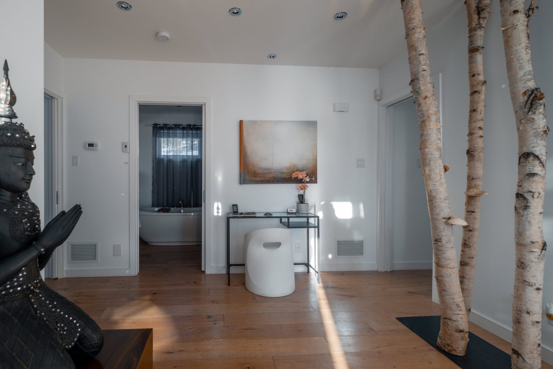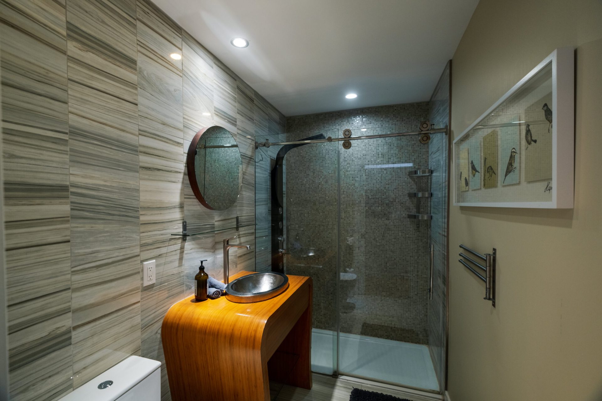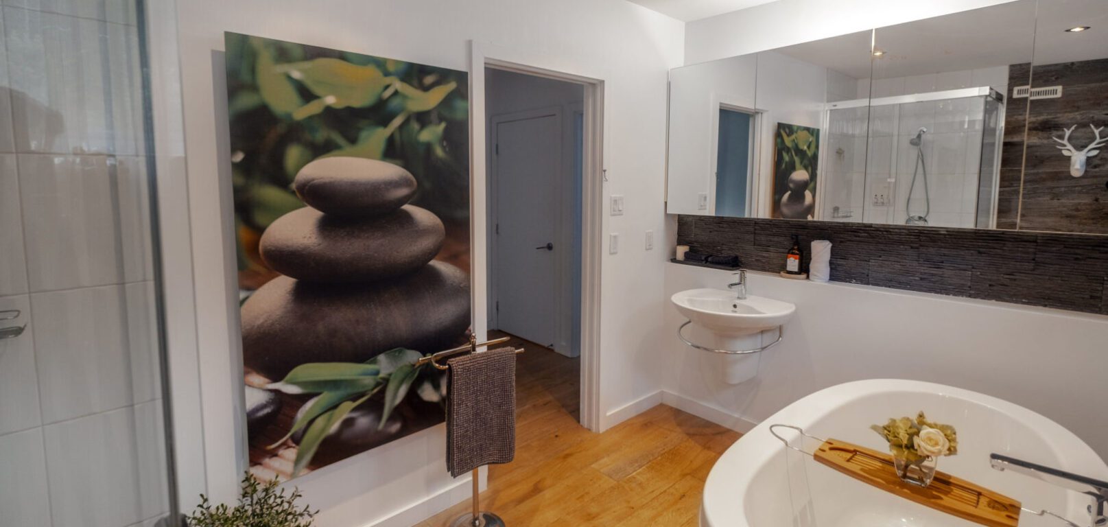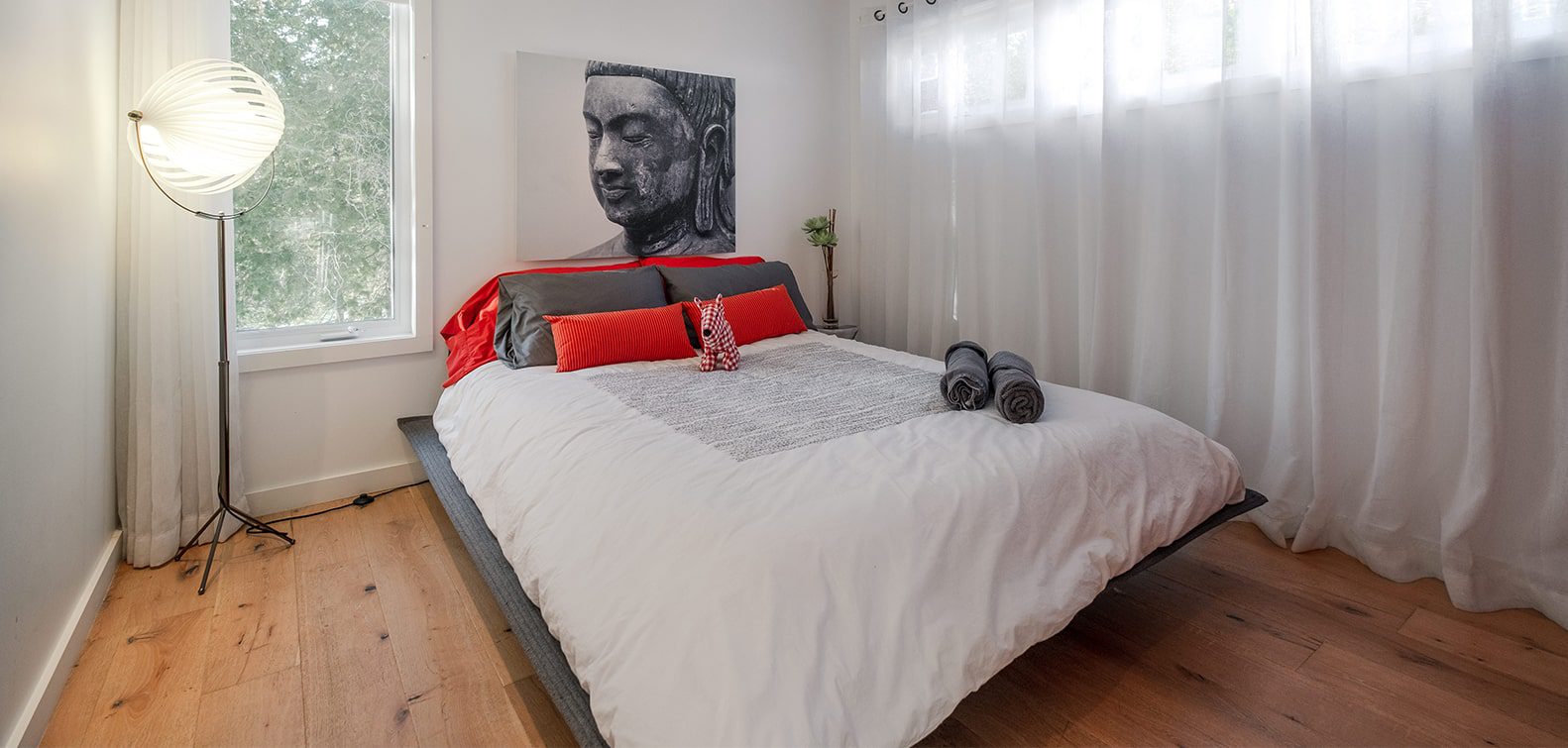 Au niveau rez-de-jardin, vous trouverez deux chambres spacieuses équipées de matelas et de literie qualité hôtel (1 chambre avec lit King + 1 chambre avec lit Queen) et une salle de bain avec douche en verre. Au fond du couloir, une salle de cinéma maison avec écran 60 », système de son et Blu-Ray/DVD à disposition sera parfaite pour les longues soirées d’hiver. Notez que le chalet dispose d’un deuxième frigo au sous-sol, de deux lits (parcs) pour bébés et de 2 réhausseurs de siège. Un espace buanderie avec laveuse et sécheuse est disponible au niveau rez-de-jardin.