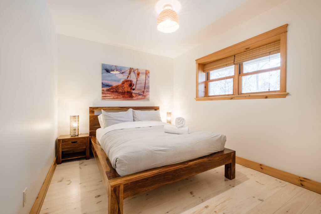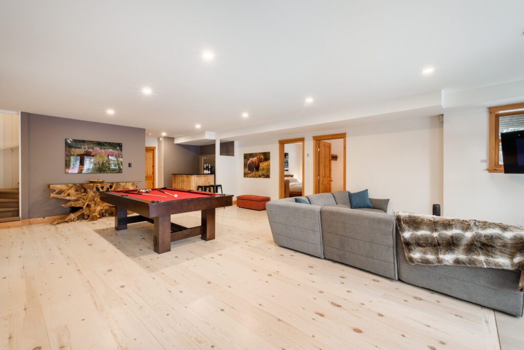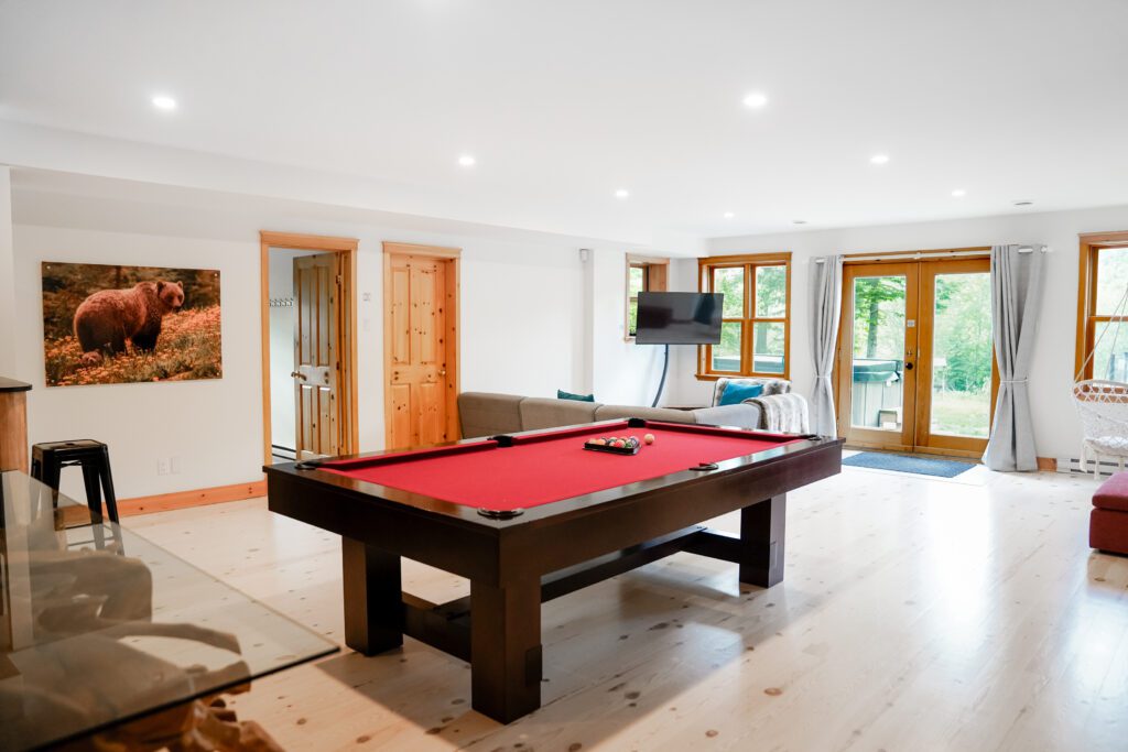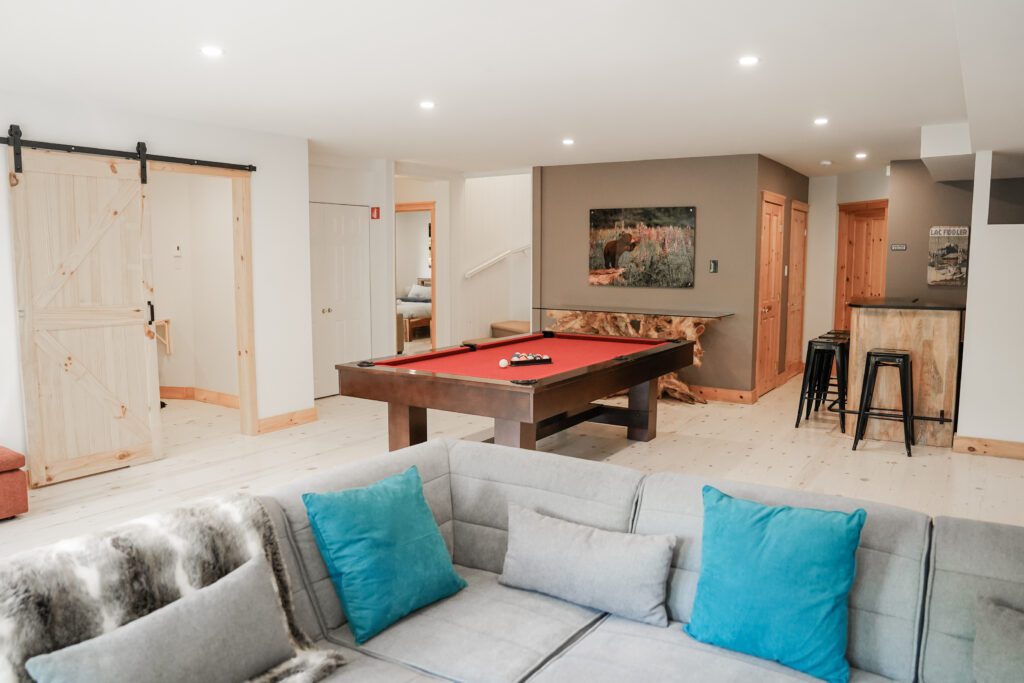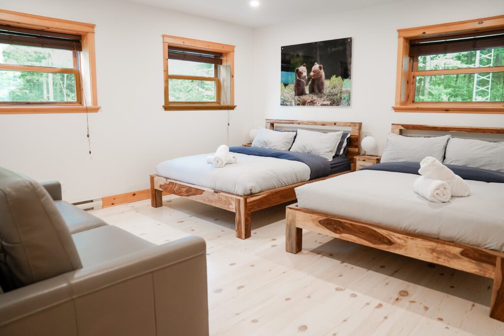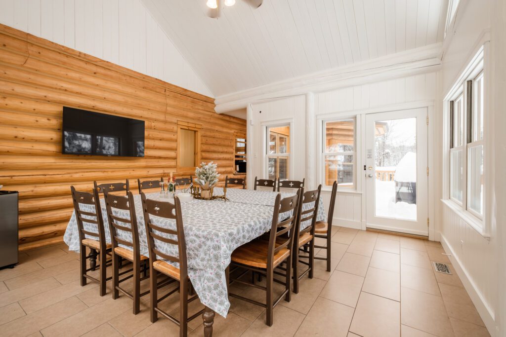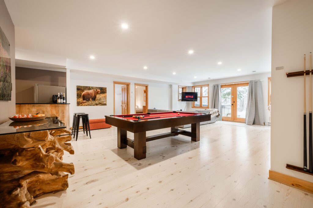Ce chalet très spacieux comprend 6 chambres à coucher, 3 salles de bains complètes et 1 foyer au bois intérieur. Il peut loger aisément jusqu’à 18 personnes. La cuisine est équipée d’appareils électroménagers en acier inoxydable, incluant un lave-vaisselle et un four micro-ondes. D’autres commodités telles que la télévision par satellite, Wi-Fi haute vitesse Starlink illimité, une table de billard (convertible en table de ping pong), une laveuse et une sécheuse sont également fournies. Un coin feu extérieur avec des chaises confortables pour relaxer est accessible durant les 3 saisons.
