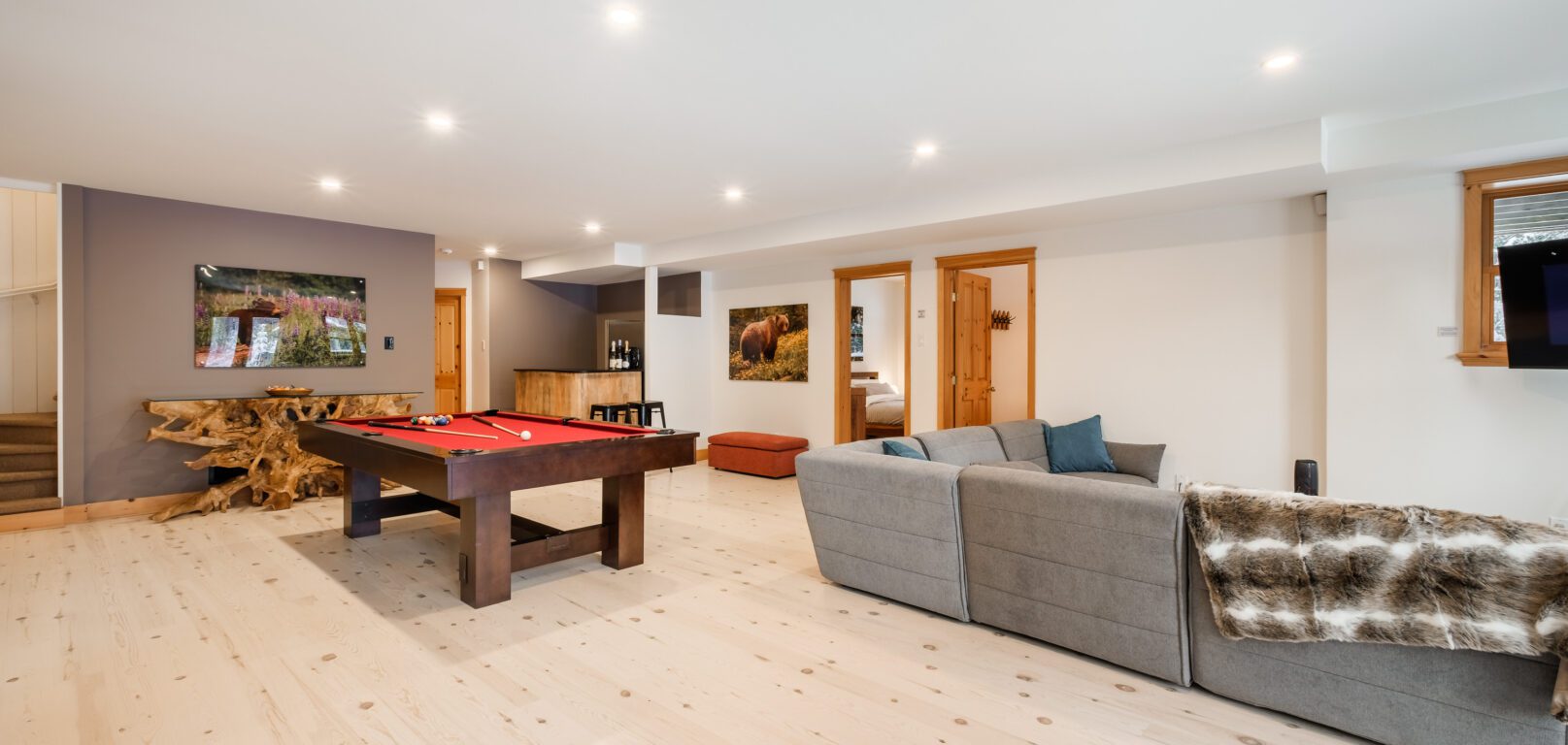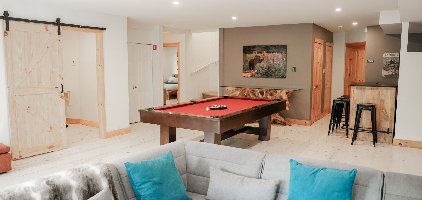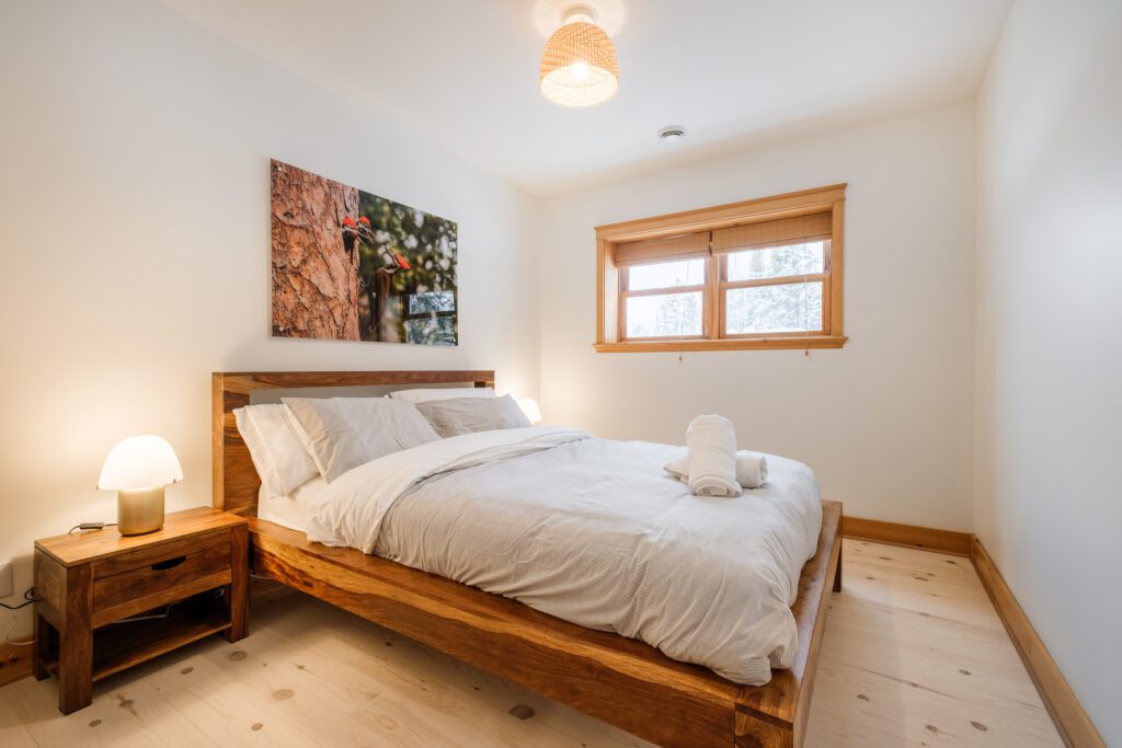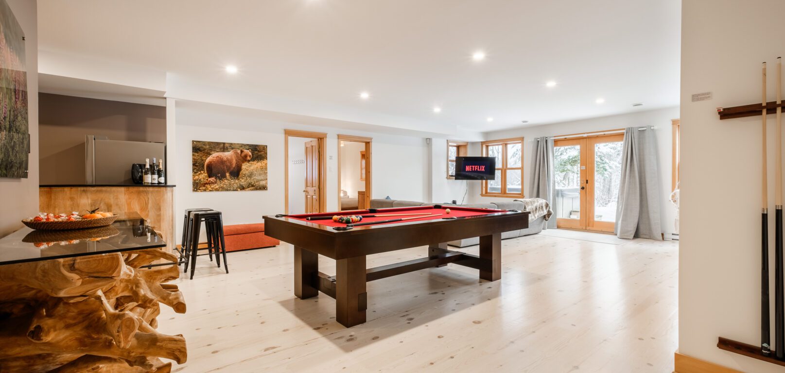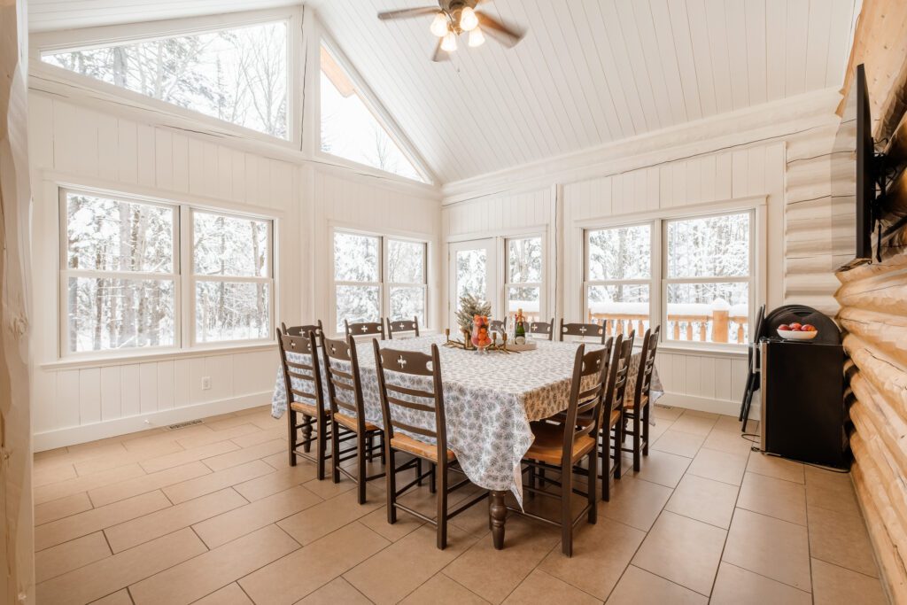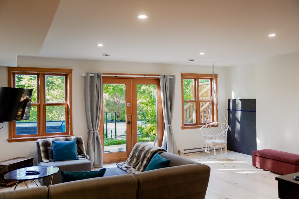 Ce chalet très spacieux comprend 6 chambres à coucher, 3 salles de bains complètes et 1 foyer au bois intérieur. Il peut loger aisément jusqu’à 18 personnes. La cuisine est équipée d’appareils électroménagers en acier inoxydable, incluant un lave-vaisselle et un four micro-ondes. D’autres commodités telles que la télévision par satellite, Wi-Fi haute vitesse Starlink illimité, une table de billard (convertible en table de ping pong), une laveuse et une sécheuse sont également fournies. Un coin feu extérieur avec des chaises confortables pour relaxer est accessible durant les 3 saisons.