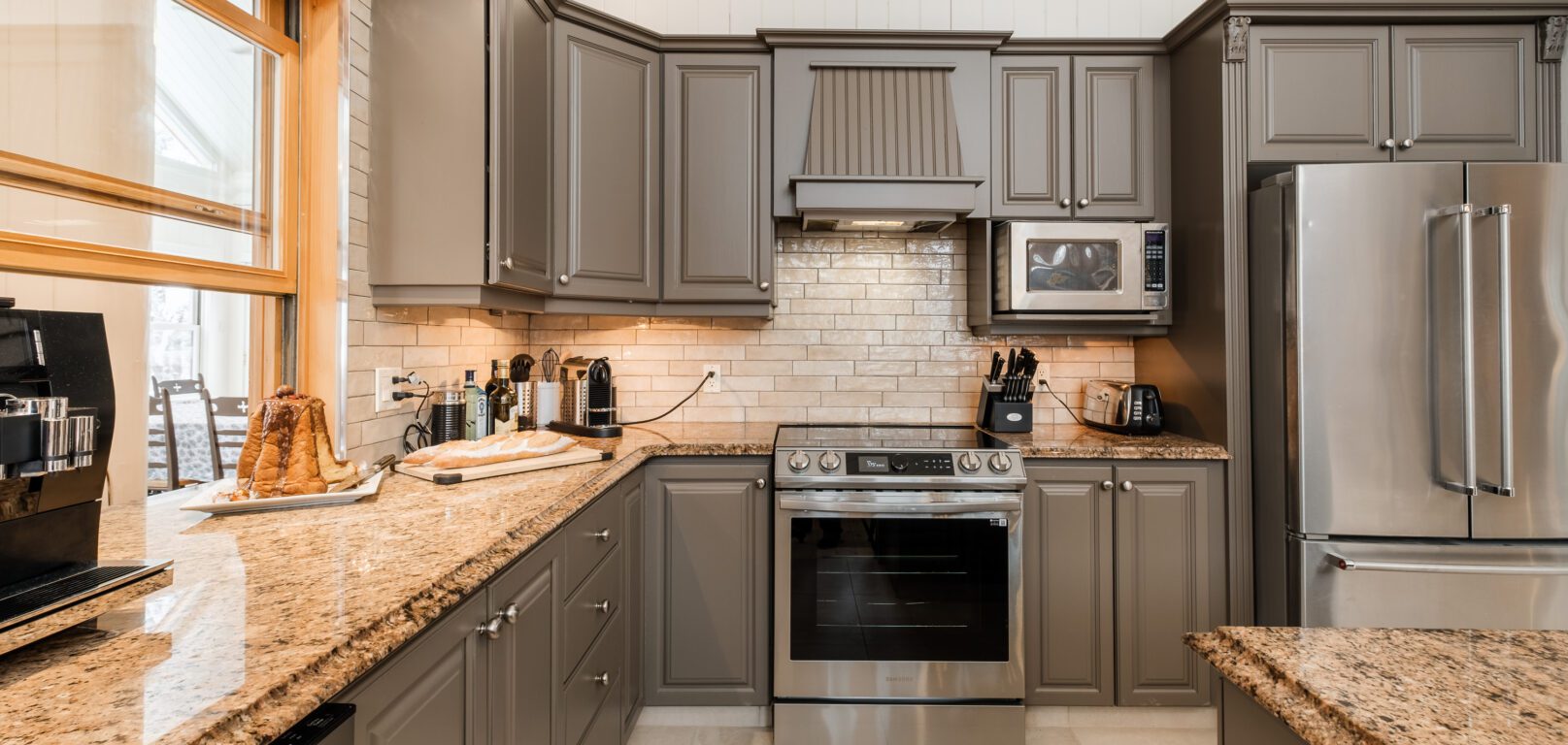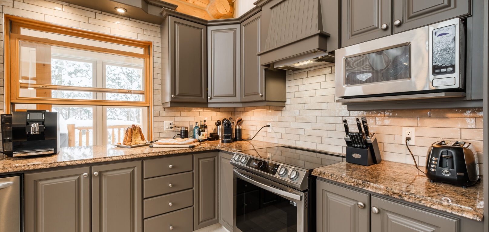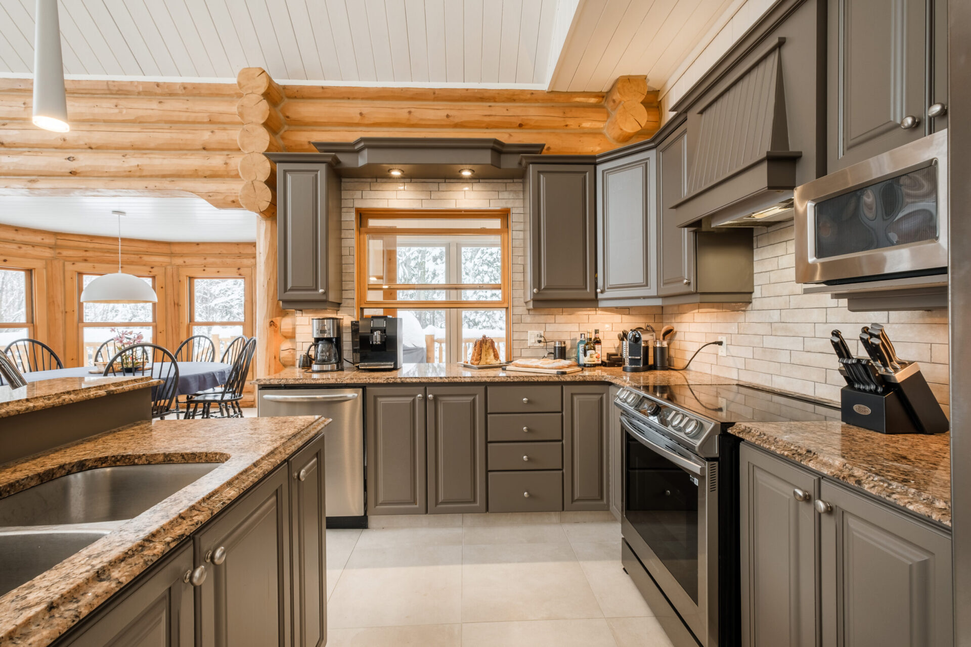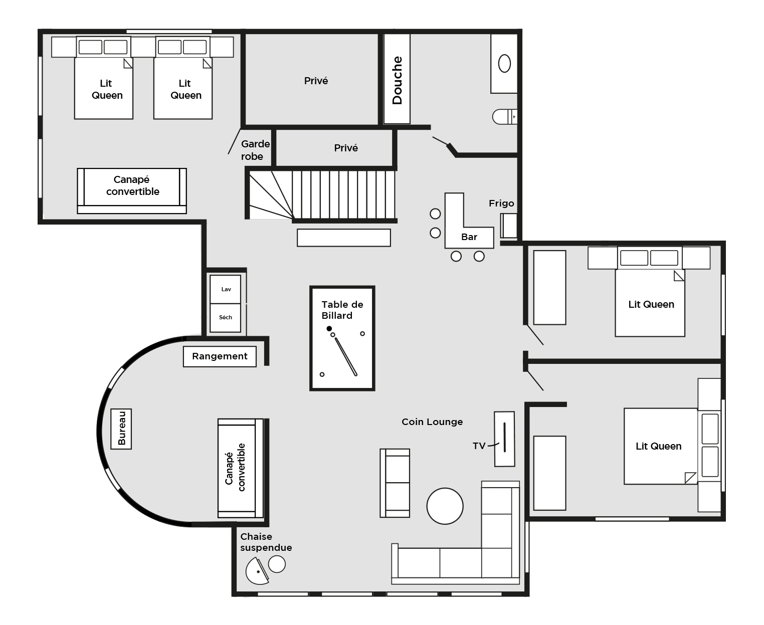 Ce chalet très spacieux comprend 6 chambres à coucher, 3 salles de bains complètes et 1 foyer au bois intérieur. Il peut loger aisément jusqu’à 18 personnes. La cuisine est équipée d’appareils électroménagers en acier inoxydable, incluant un lave-vaisselle et un four micro-ondes. D’autres commodités telles que la télévision par satellite, Wi-Fi haute vitesse Starlink illimité, une table de billard (convertible en table de ping pong), une laveuse et une sécheuse sont également fournies. Un coin feu extérieur avec des chaises confortables pour relaxer est accessible durant les 3 saisons.
