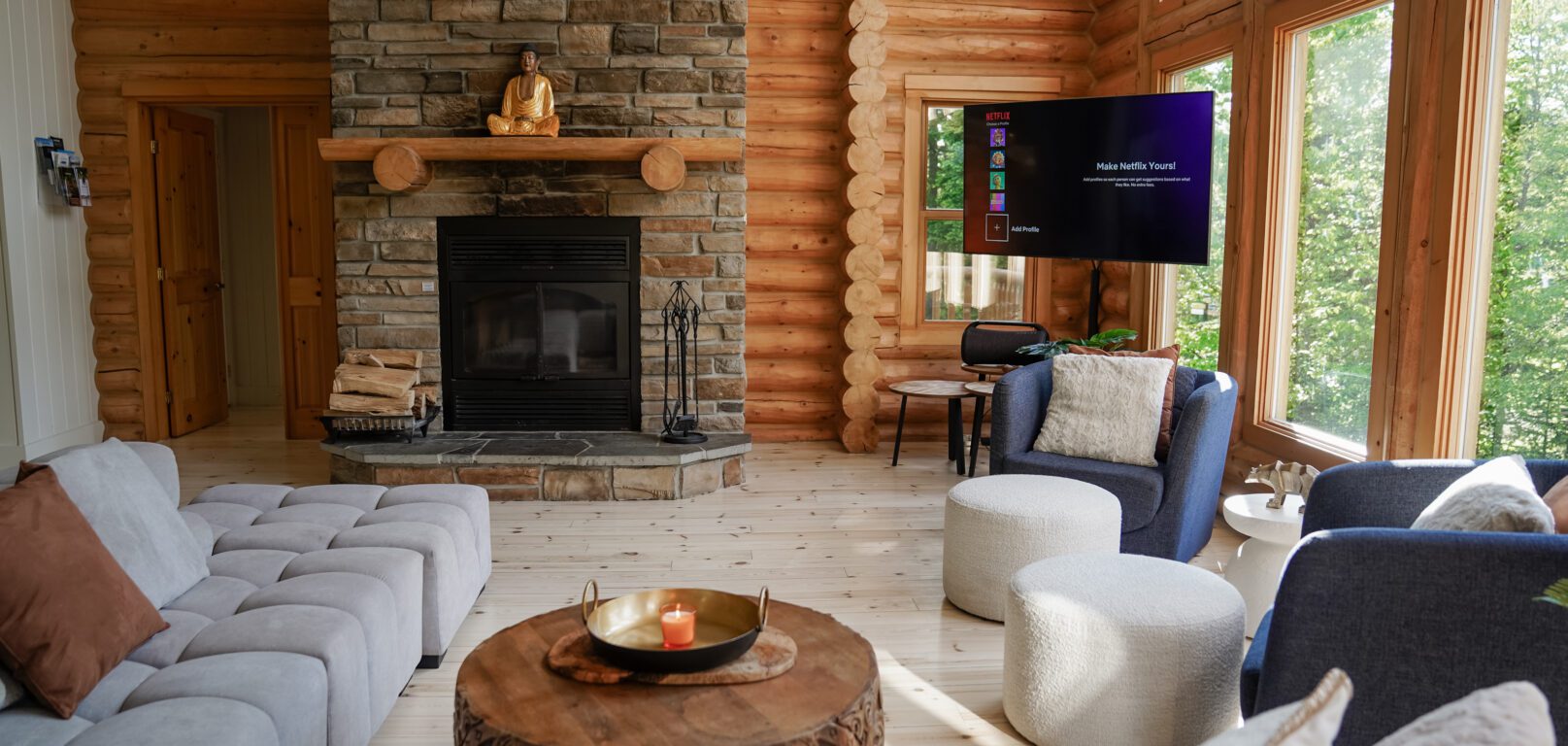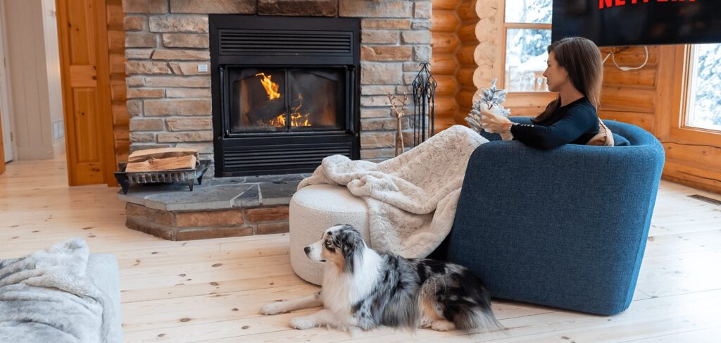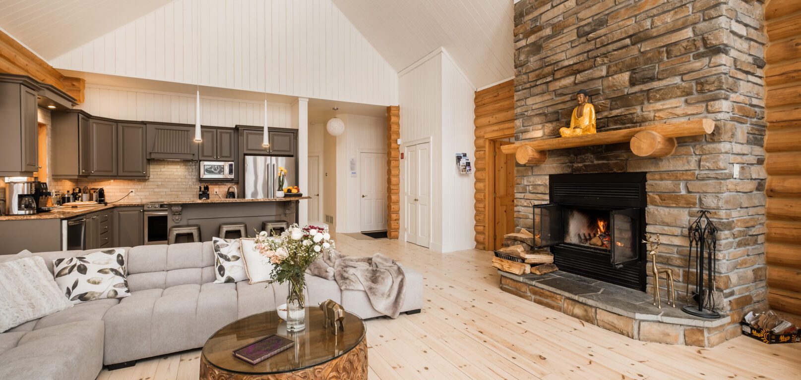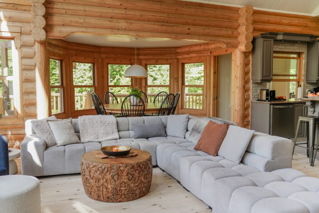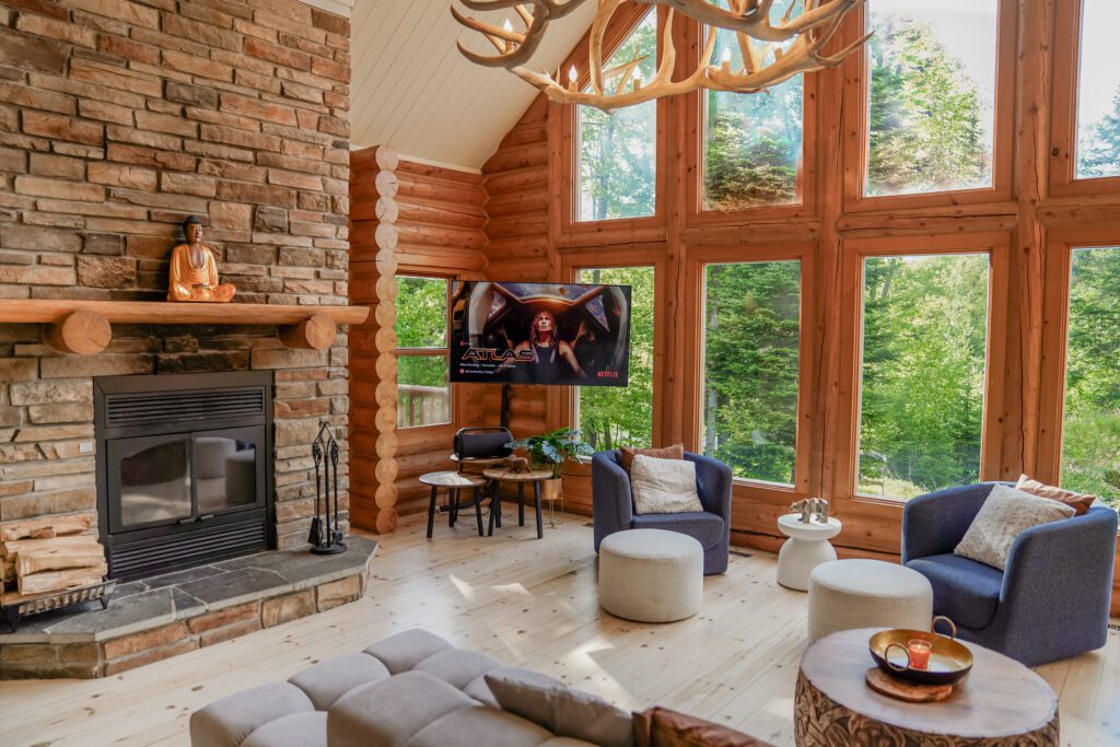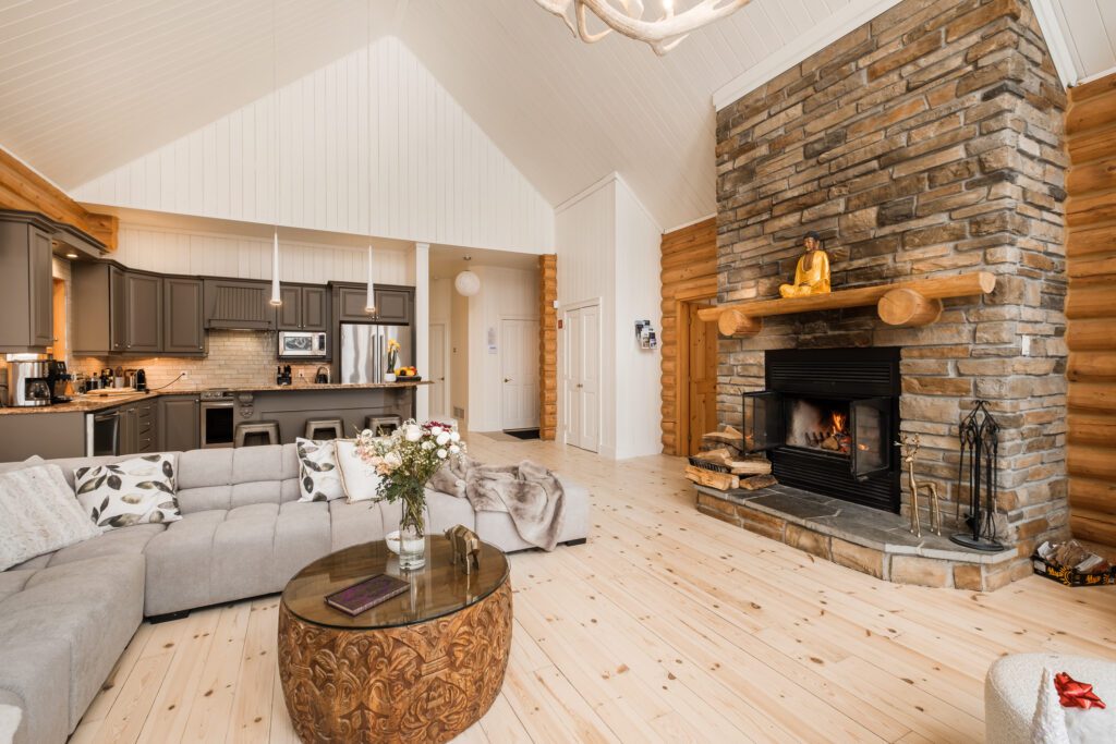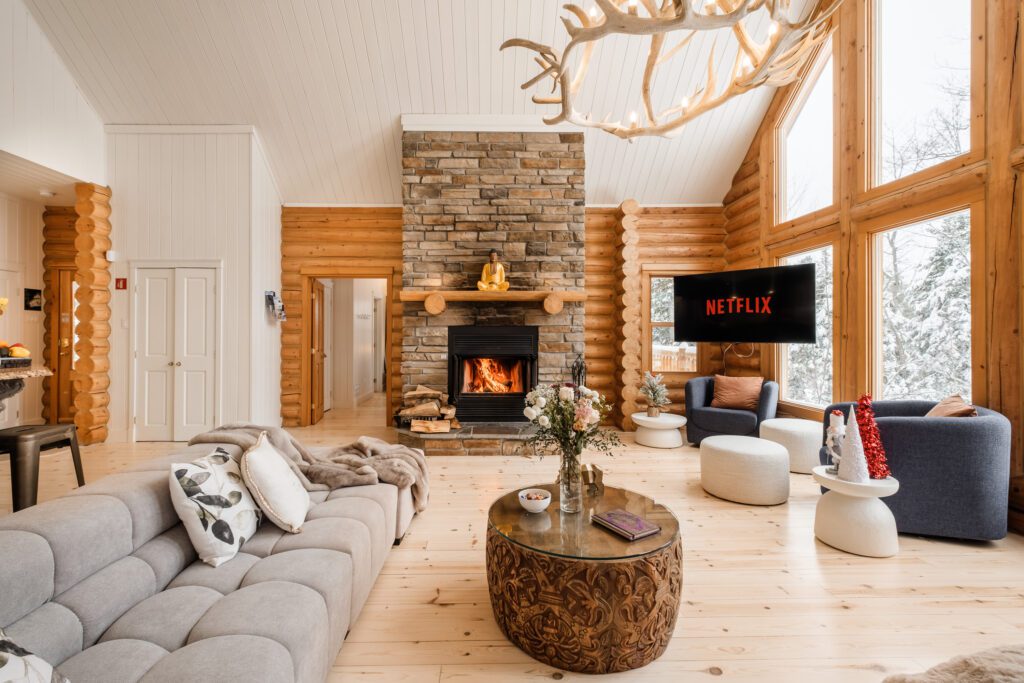 - un grand salon de style contemporain avec foyer au bois et système de son Bluetooth pour écouter votre musique préférée;