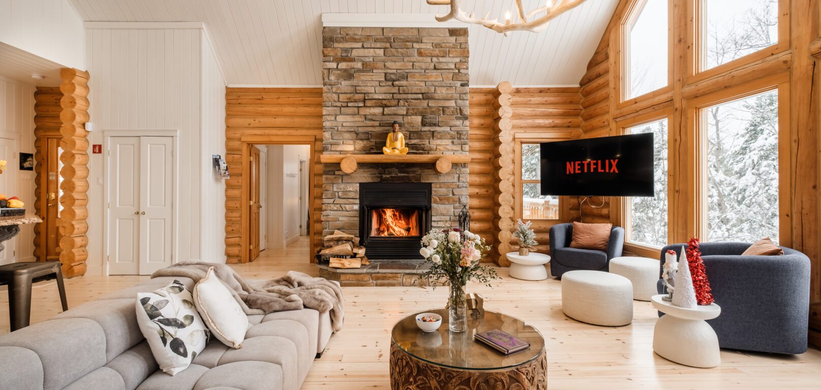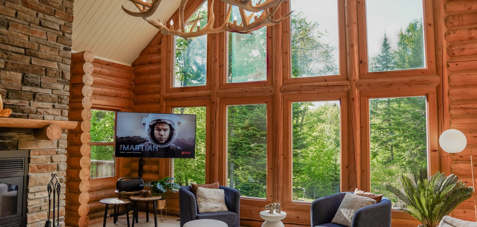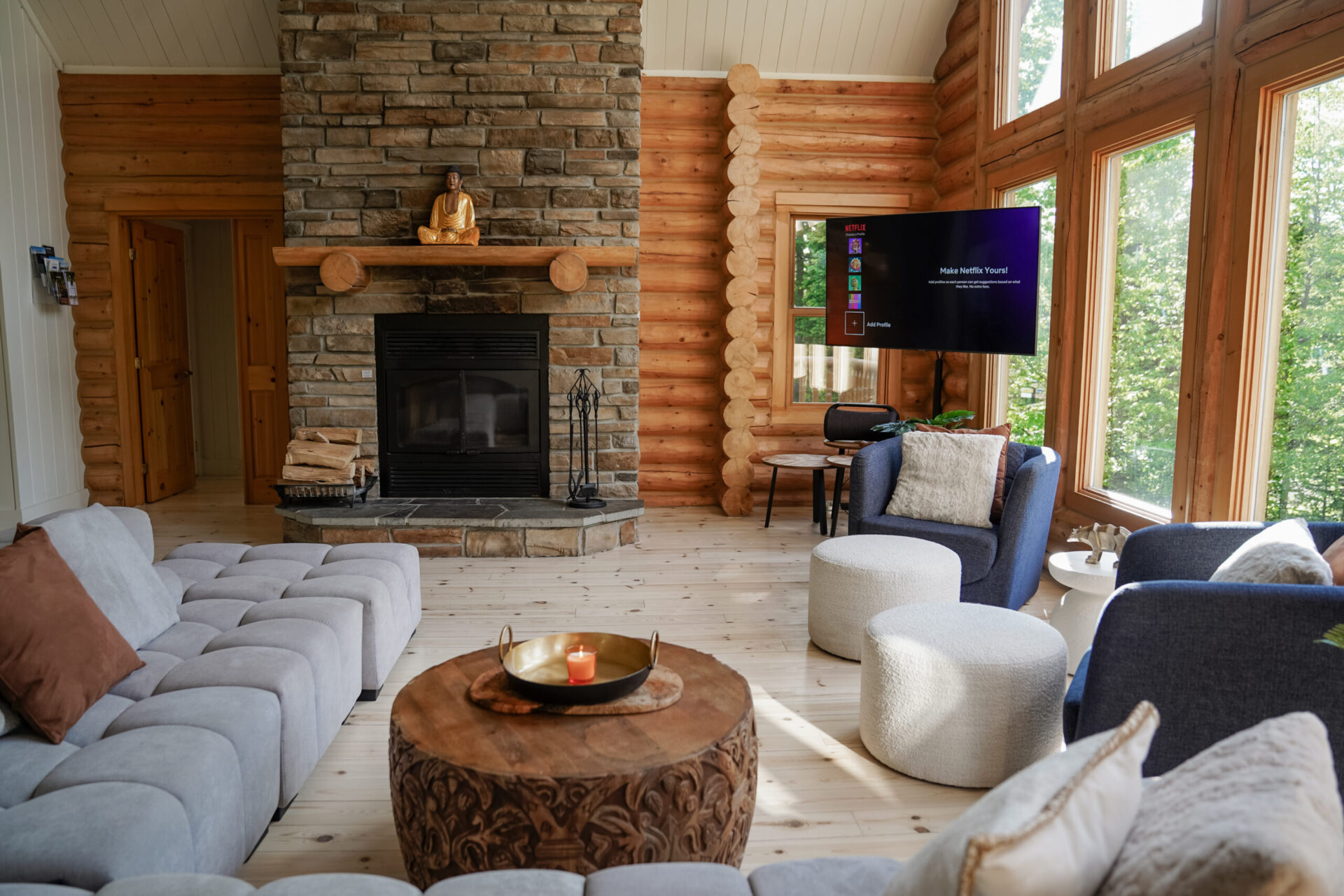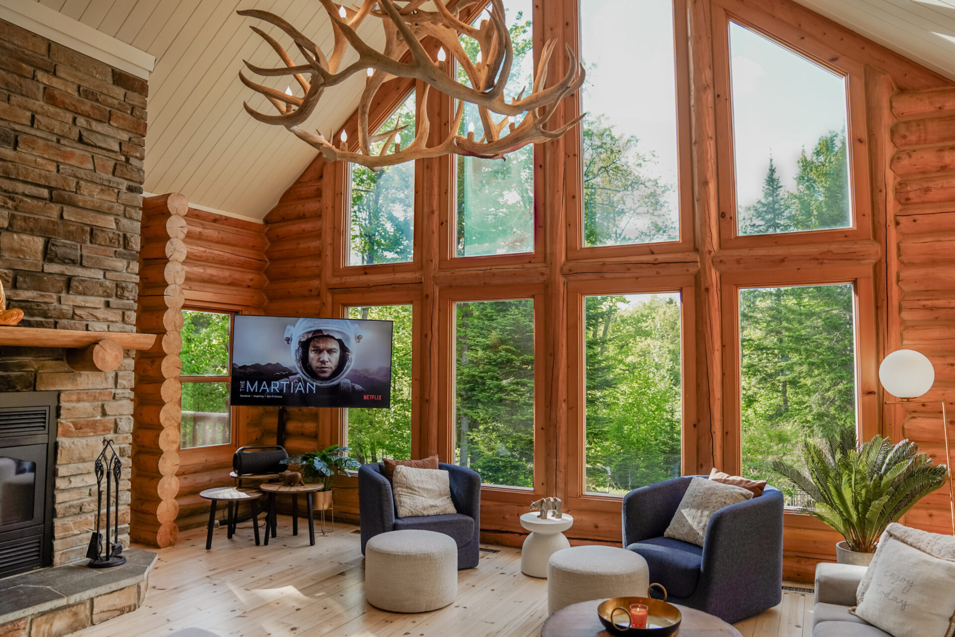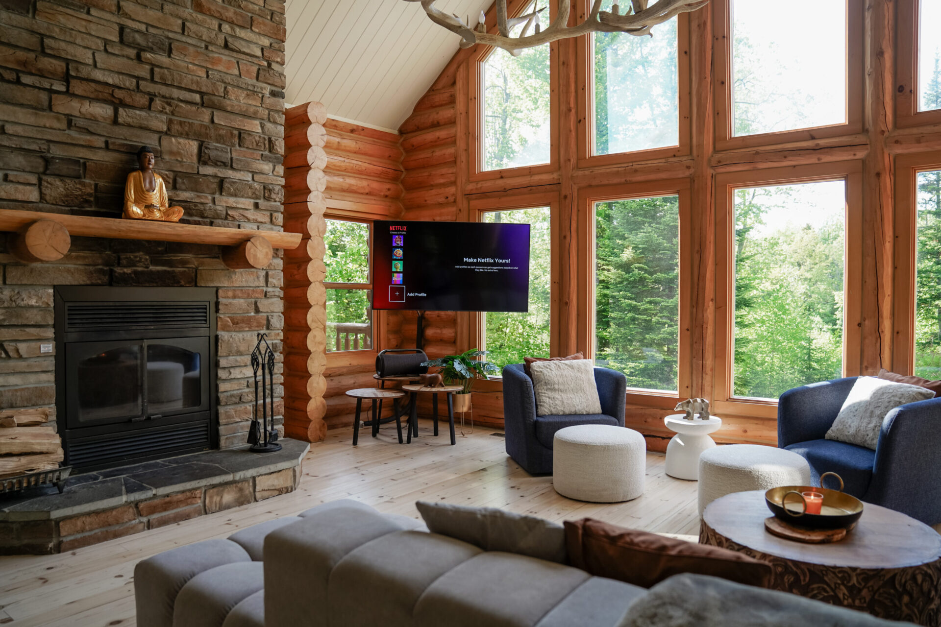 - un grand salon de style contemporain avec foyer au bois et système de son Bluetooth pour écouter votre musique préférée;