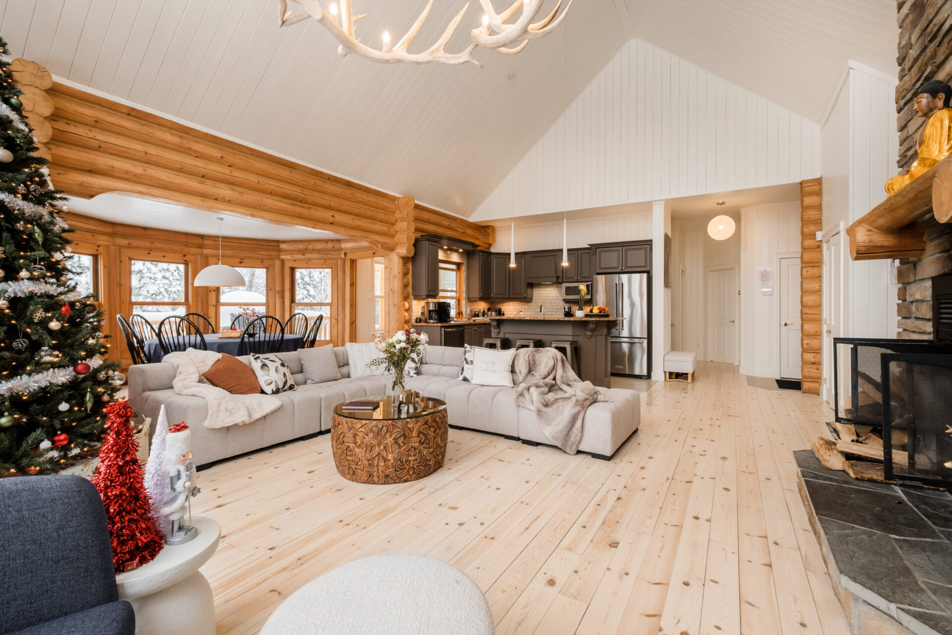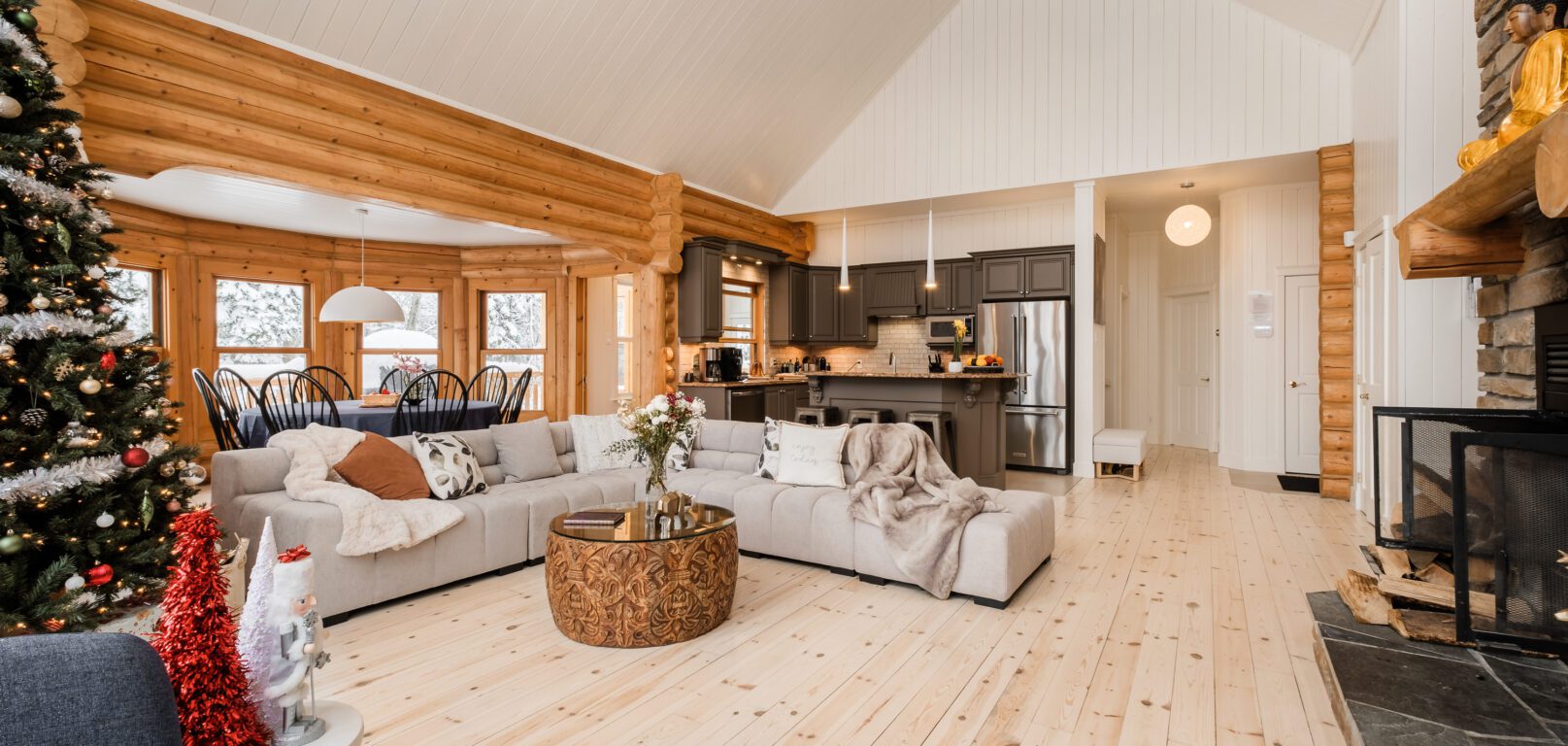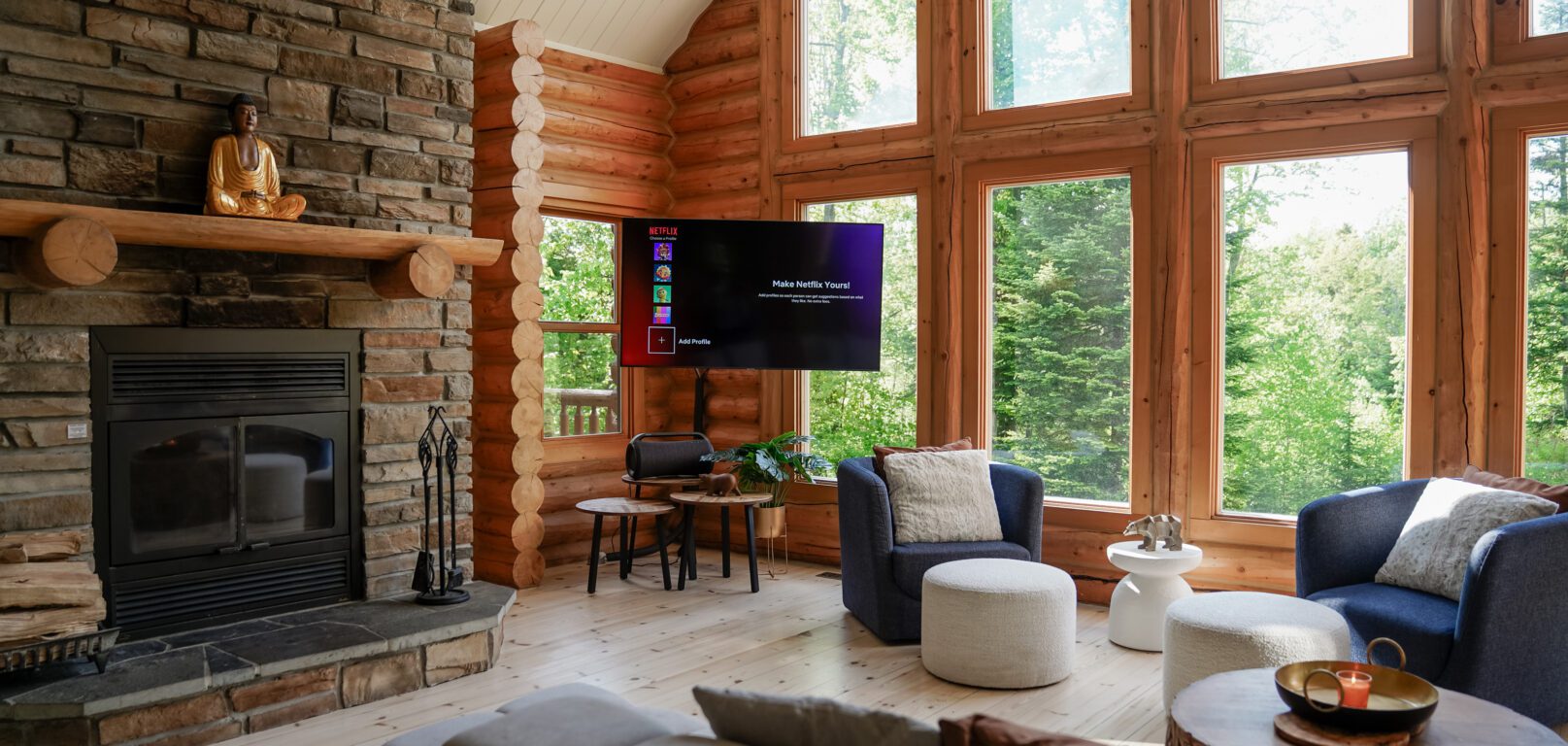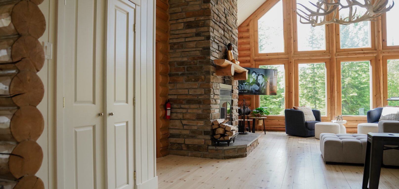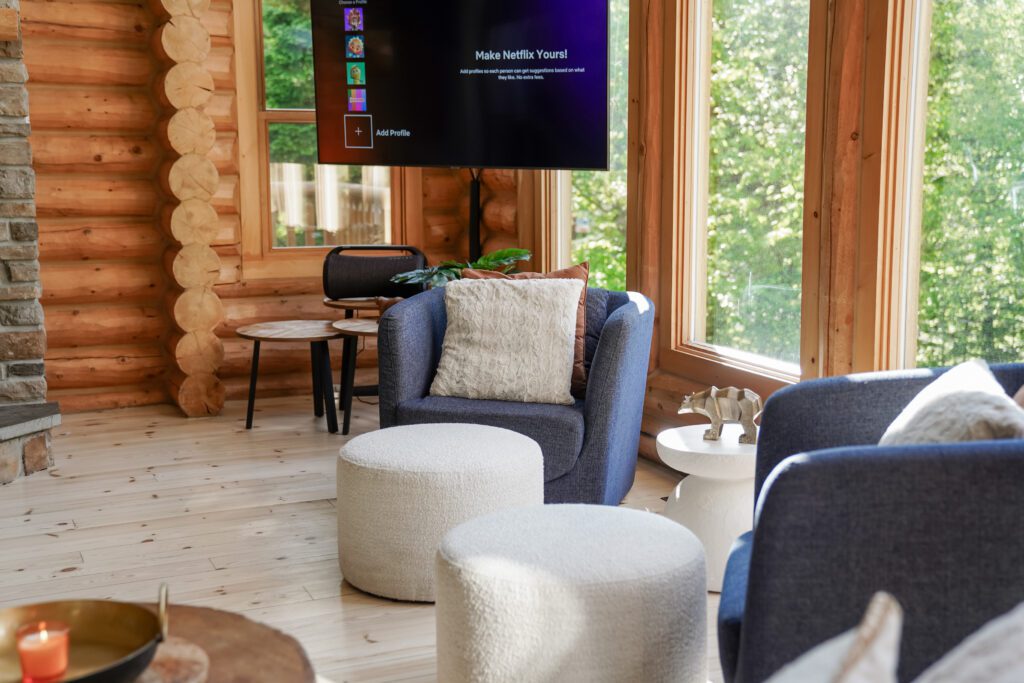 - un grand salon de style contemporain avec foyer au bois et système de son Bluetooth pour écouter votre musique préférée;