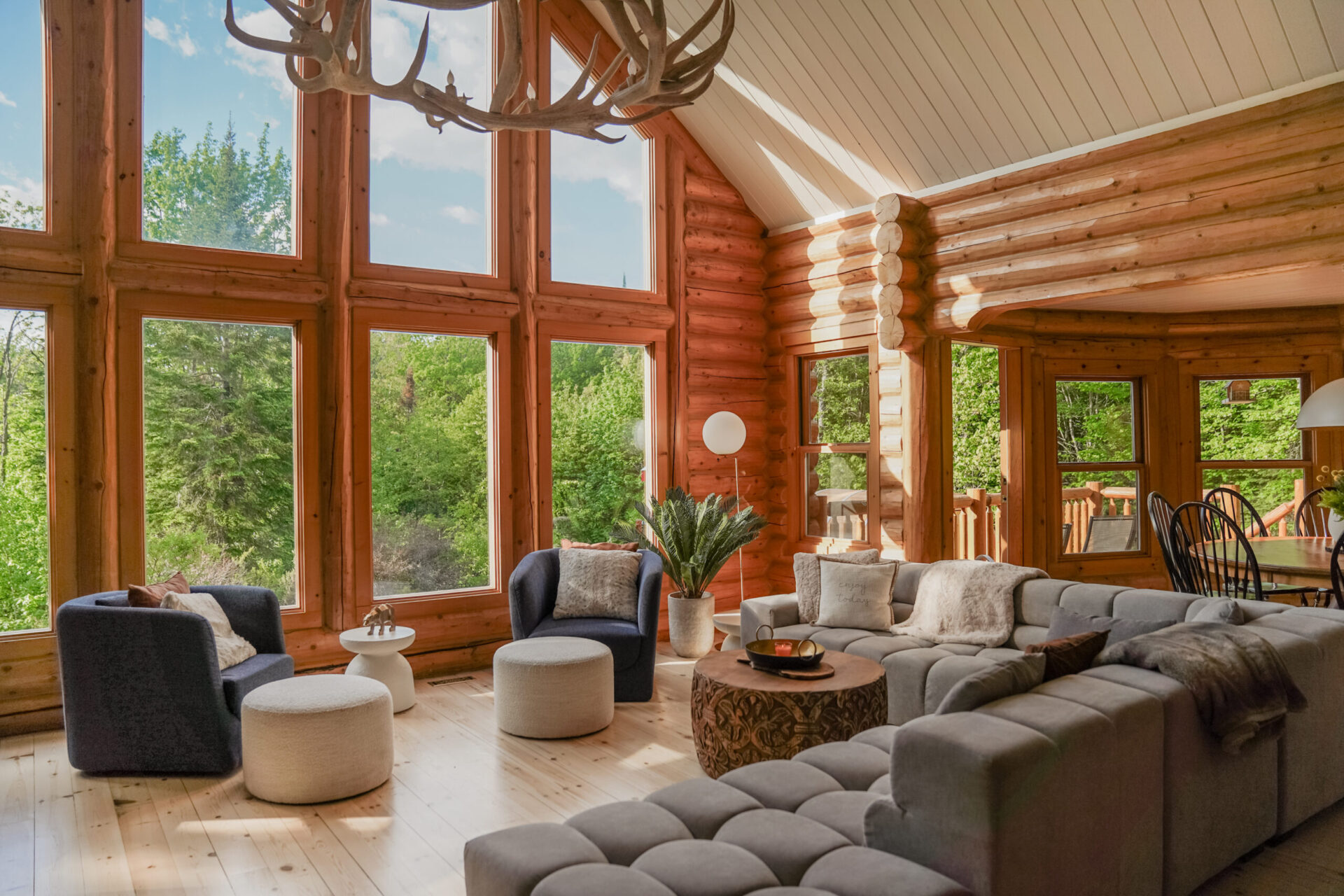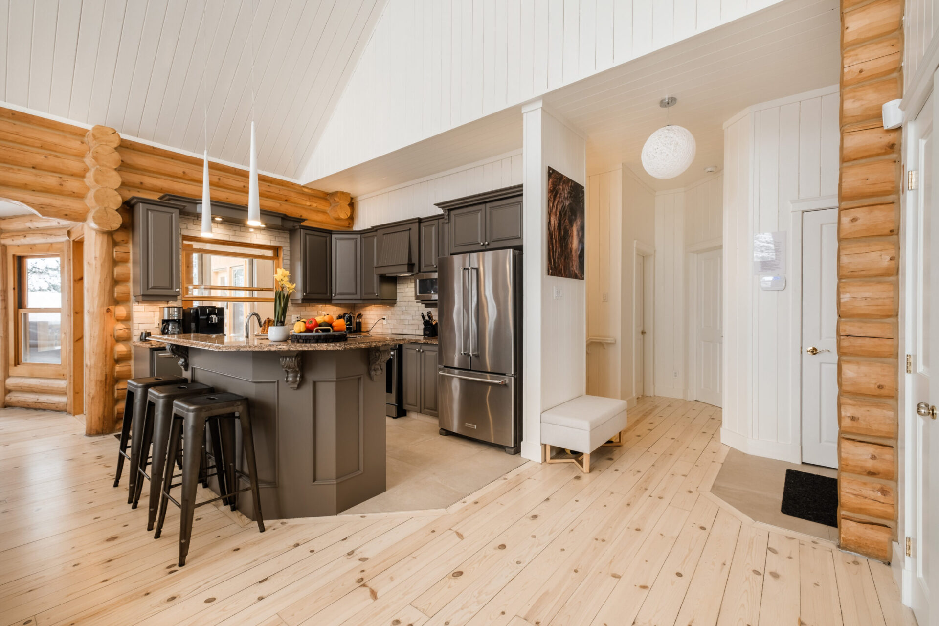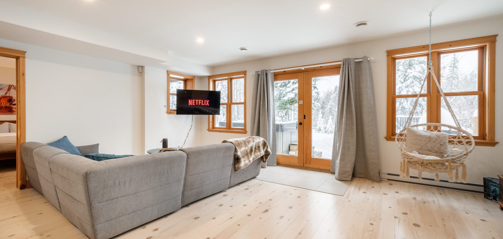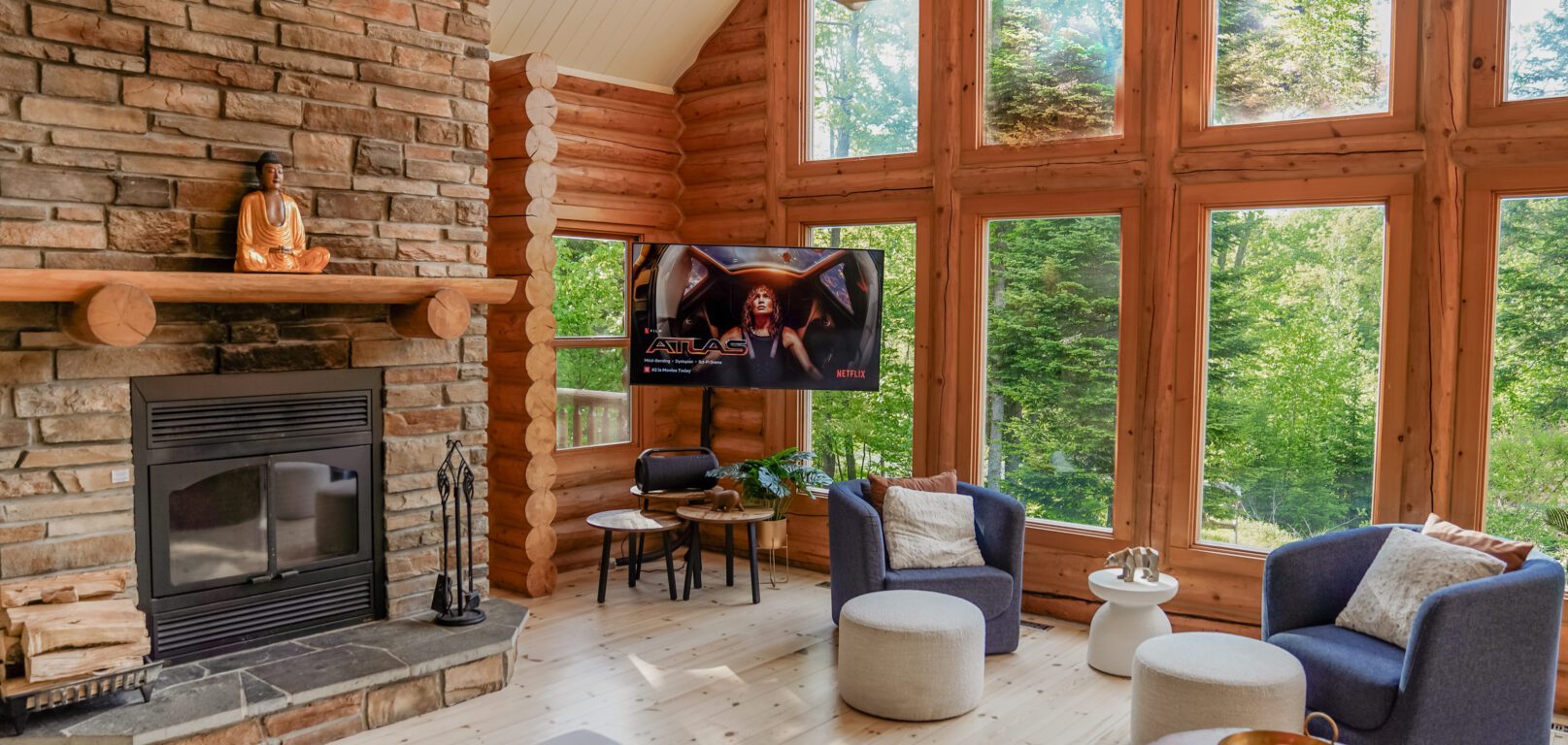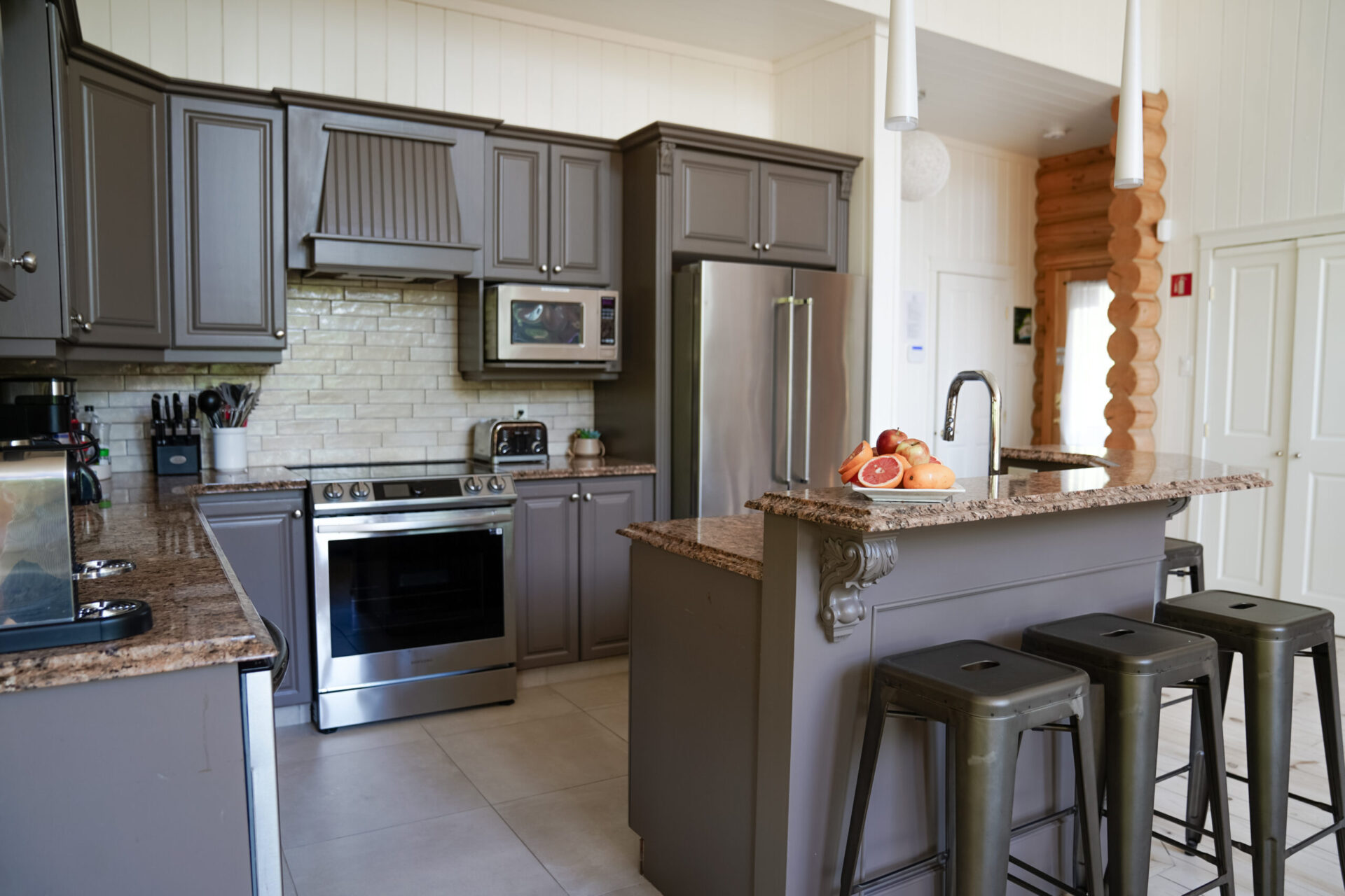 - un grand salon de style contemporain avec foyer au bois et système de son Bluetooth pour écouter votre musique préférée;