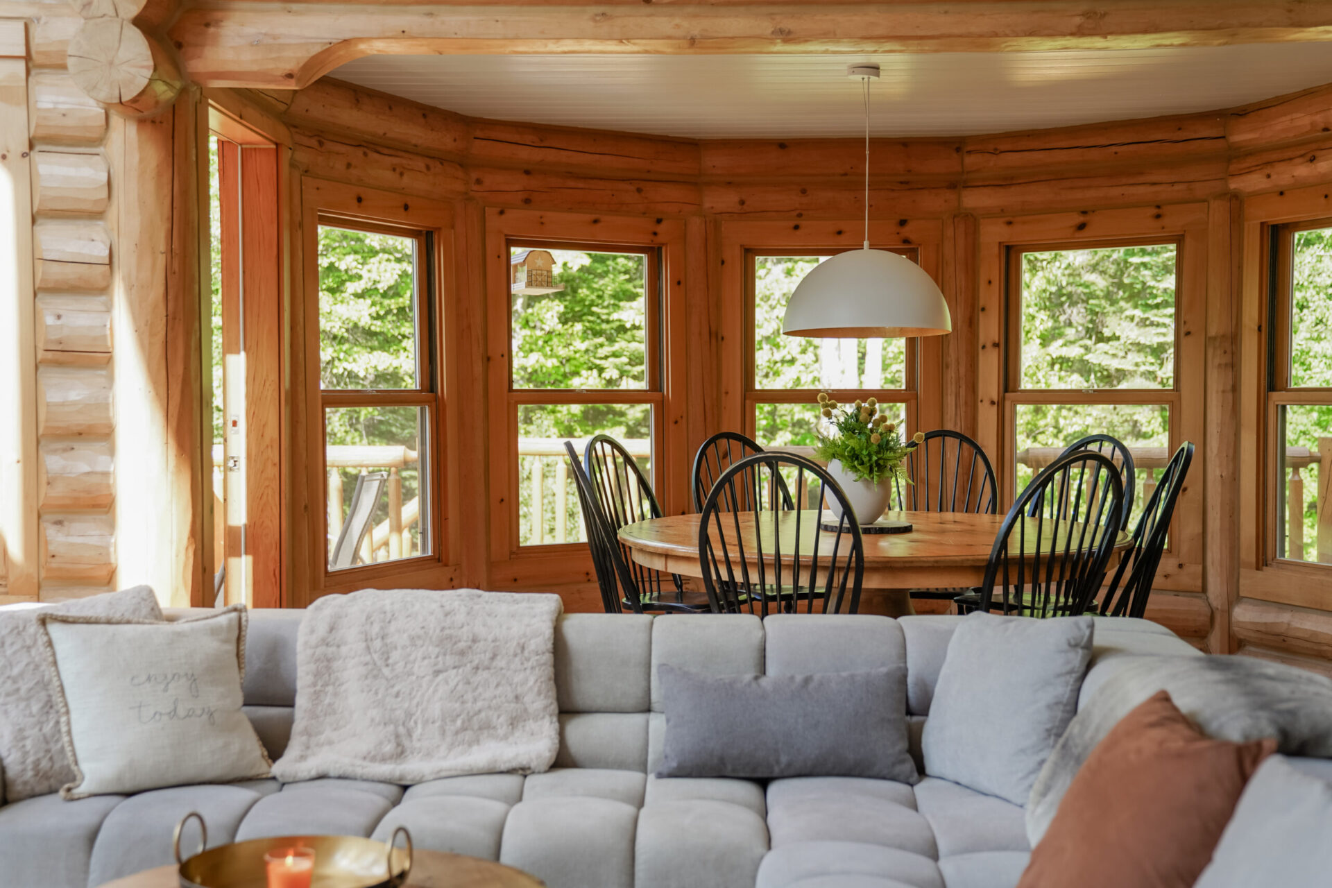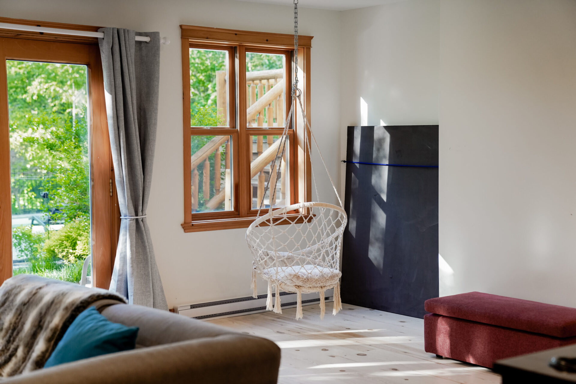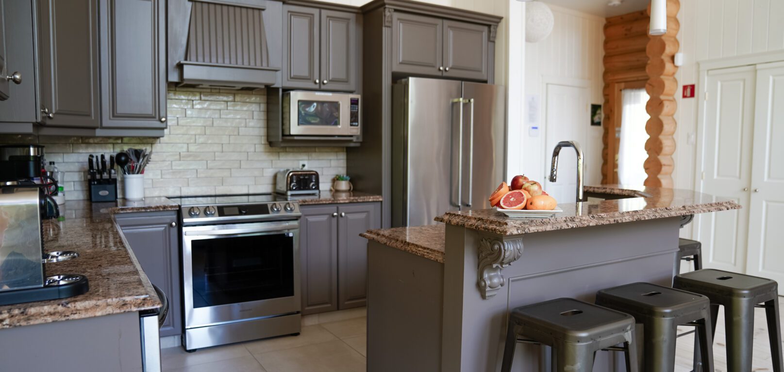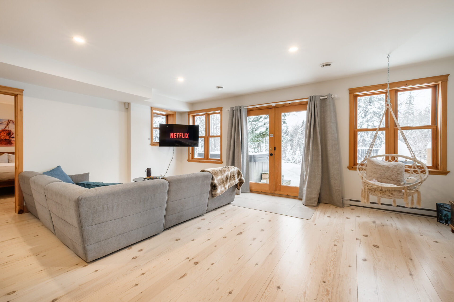 - un grand salon de style contemporain avec foyer au bois et système de son Bluetooth pour écouter votre musique préférée;