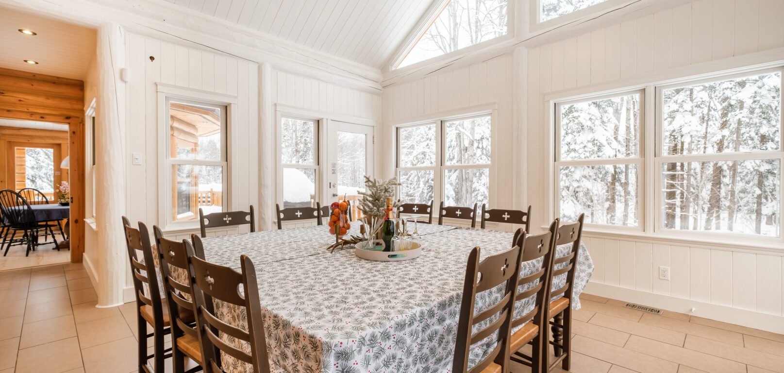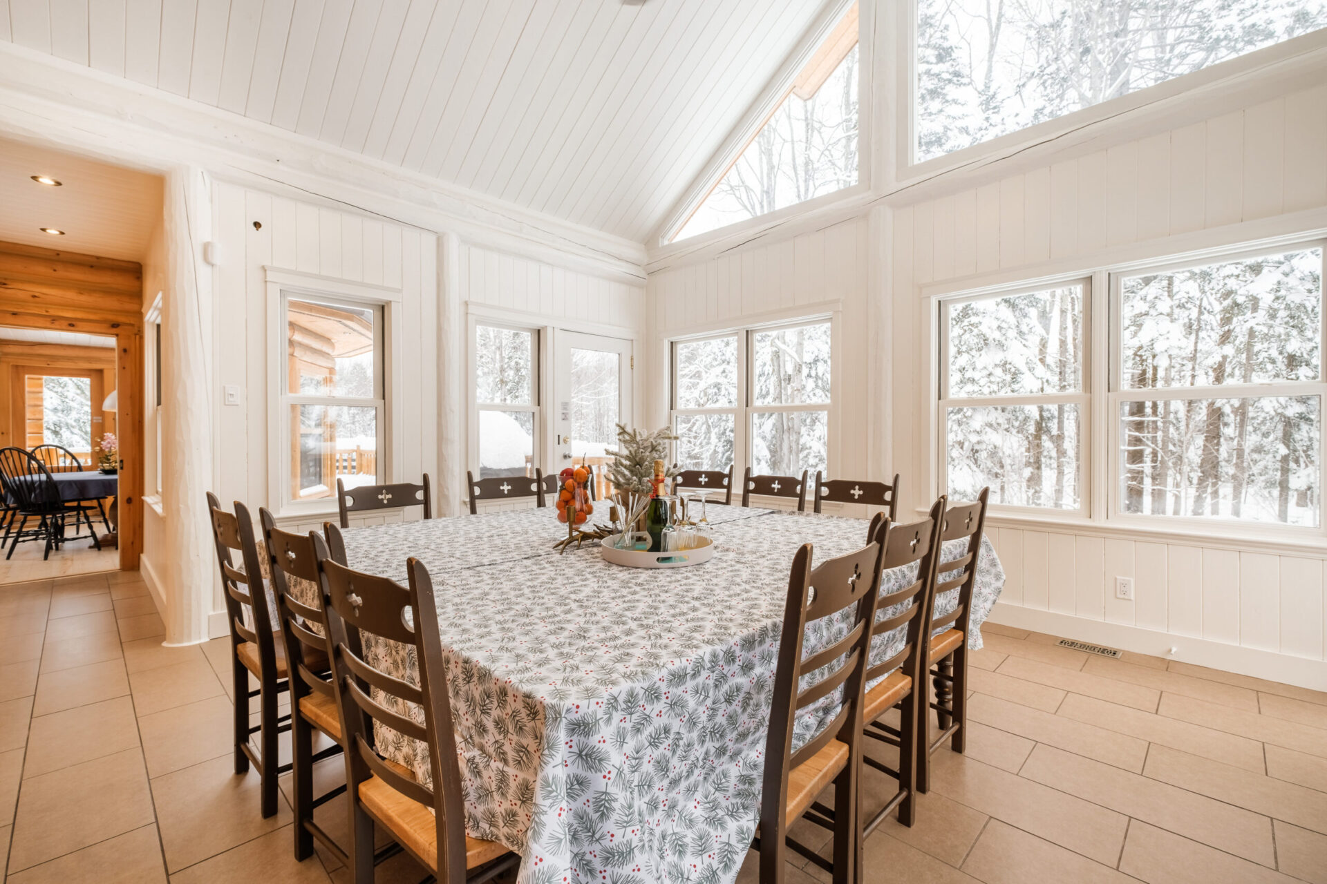 - une autre salle à manger avec une grande table à manger carrée pour 16 personnes, convertible en table de conférence, dans une pièce entièrement vitrée sur la forêt environnante