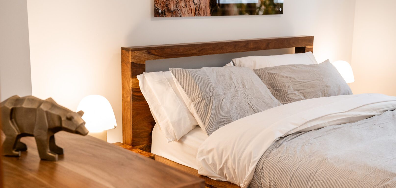 - la chambre des maîtres avec lit King et sa salle de bain complète. Toute la literie est en pur coton et les couettes sont en duvet synthétique (hypoallergène);