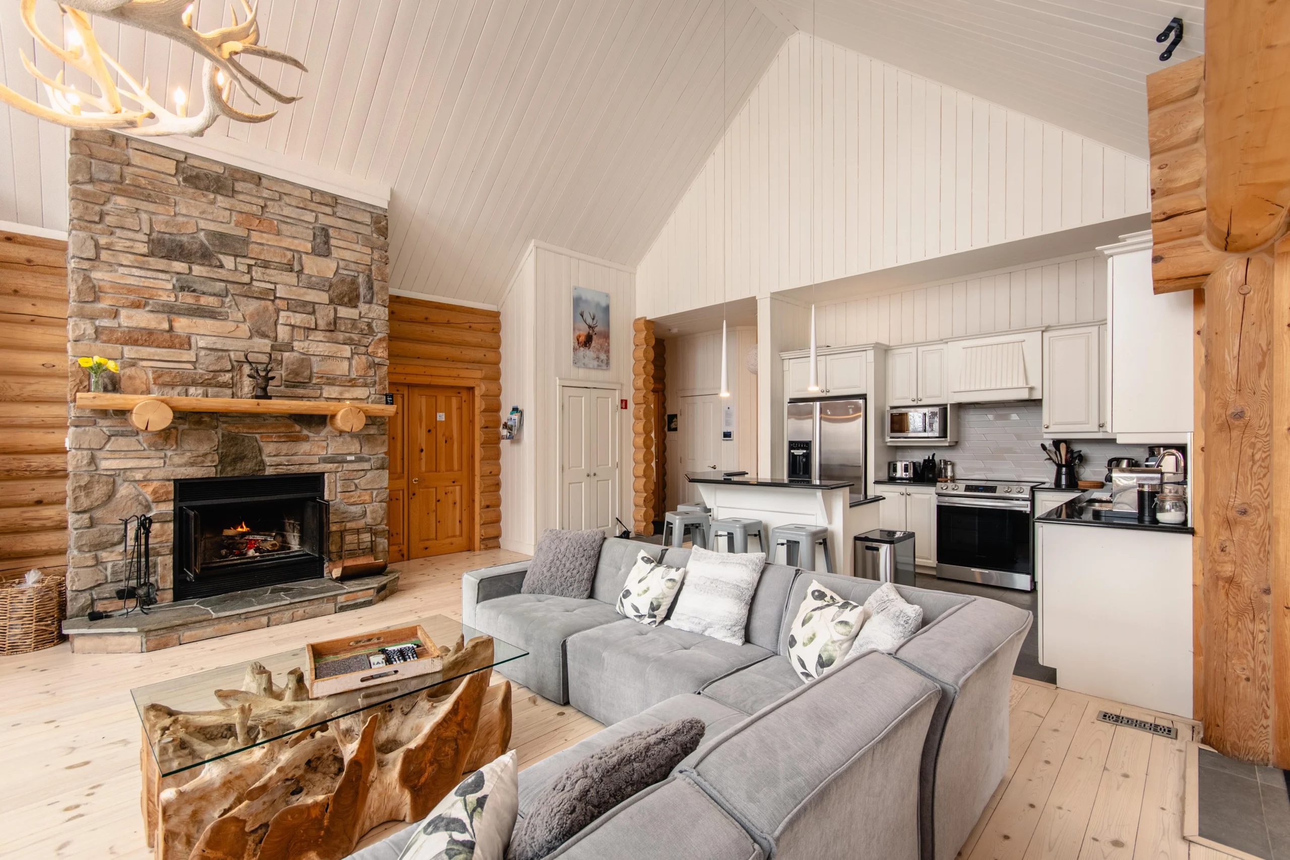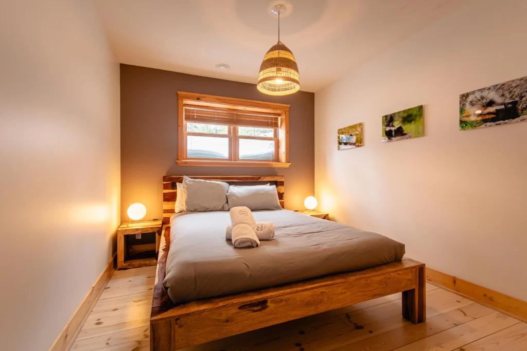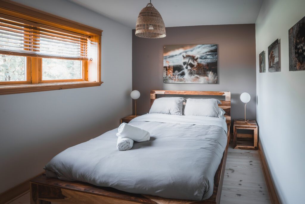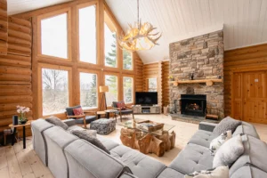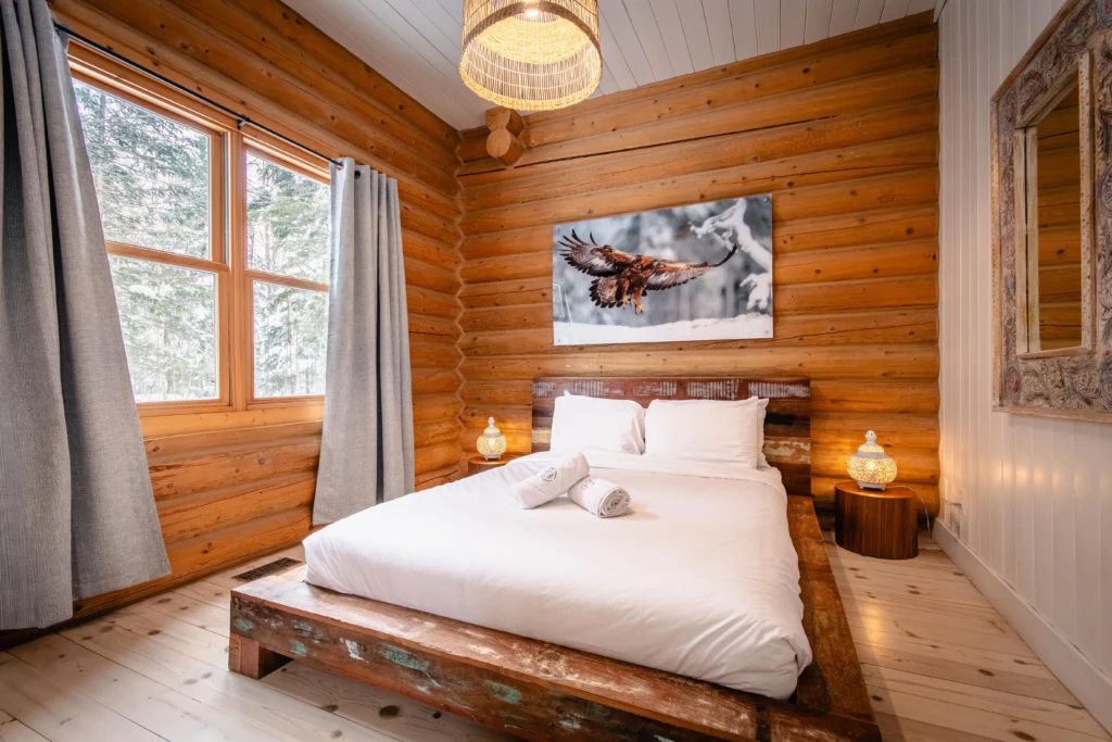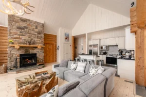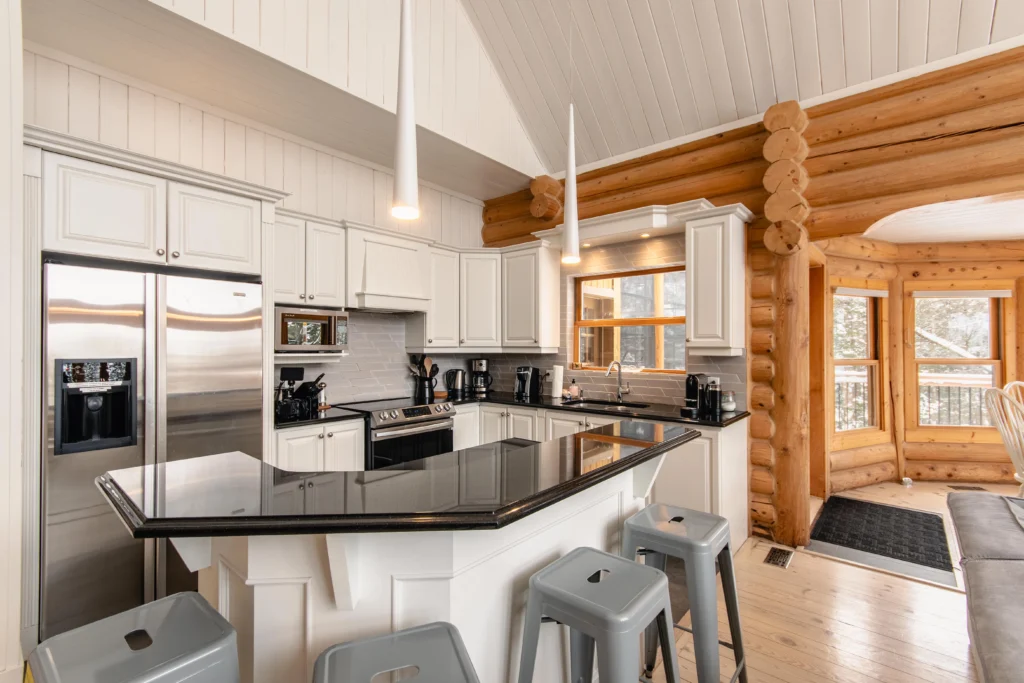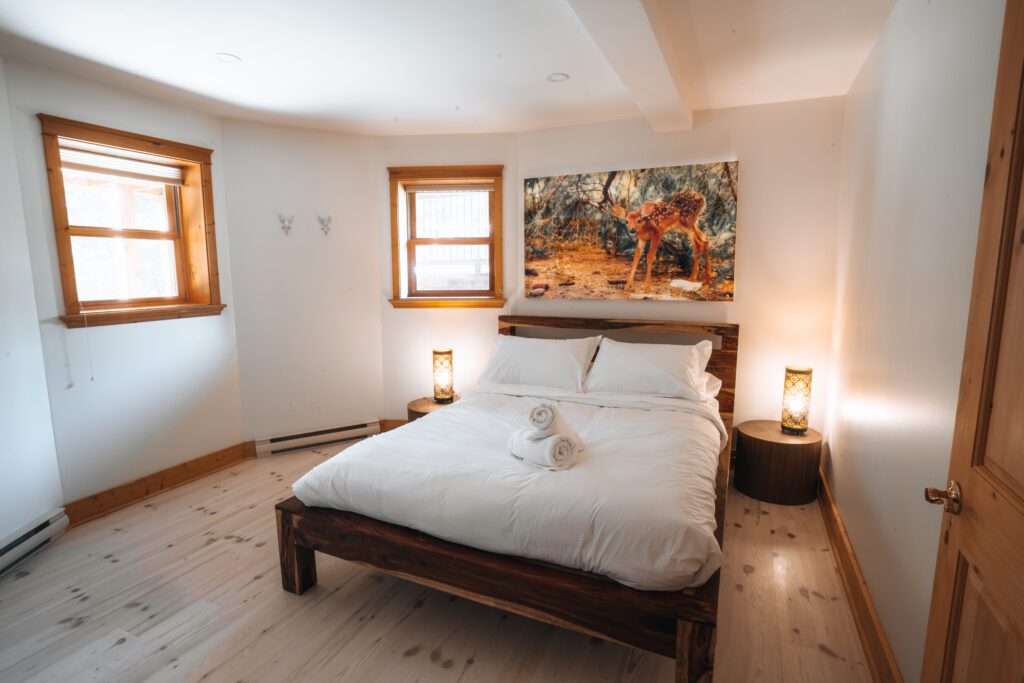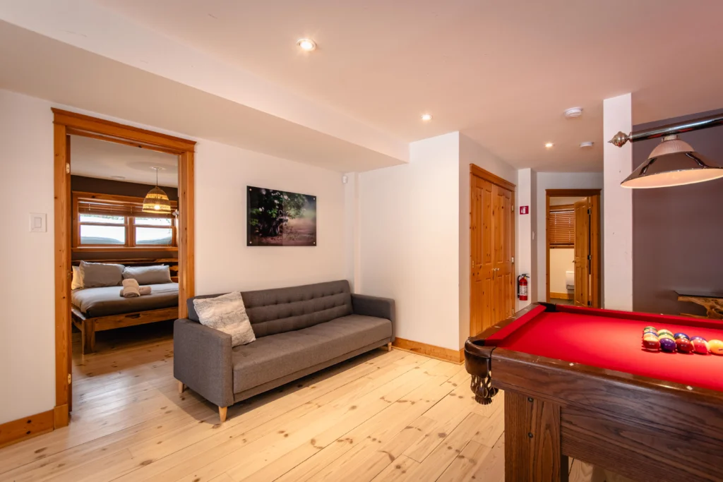 Ce chalet très spacieux comprend 5 chambres à coucher, 3 salles de bains complètes et 2 foyers au bois (un foyer par étage). Il peut loger aisément 12 adultes. La cuisine est équipée d’appareils électroménagers en acier inoxydable, incluant un lave-vaisselle et un four micro-ondes. D’autres commodités telles que la télévision par satellite, Wi-Fi haute vitesse Starlink illimité, une table de billard, une laveuse et une sécheuse sont également fournies. Un coin feu extérieur avec des chaises confortables pour relaxer est accessible durant les 3 saisons.