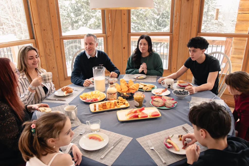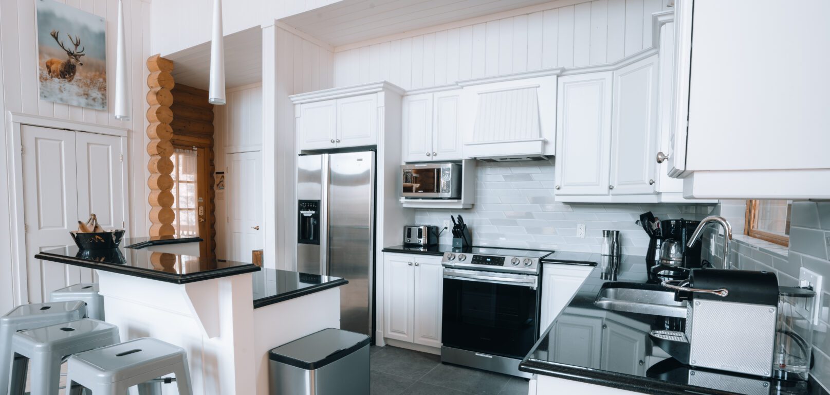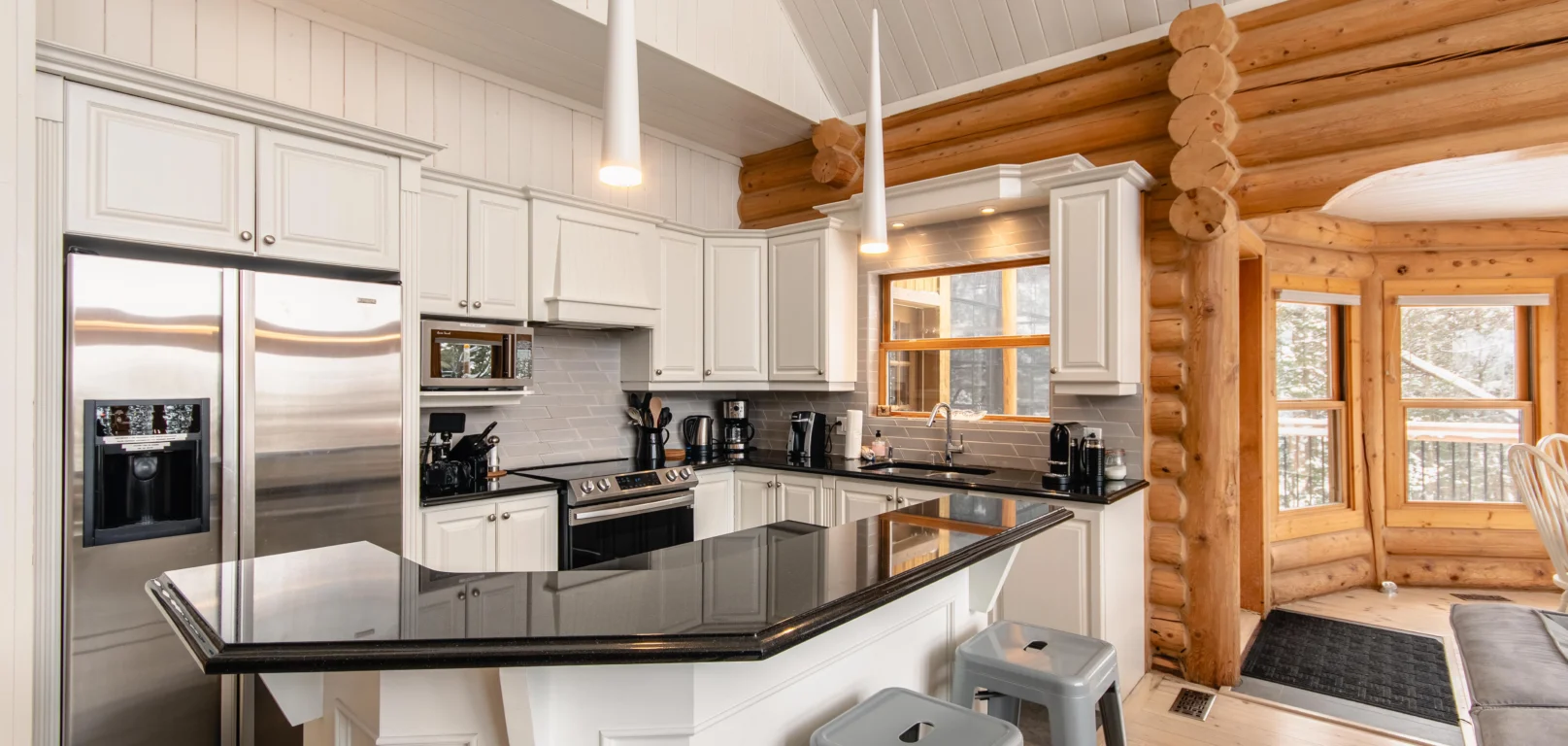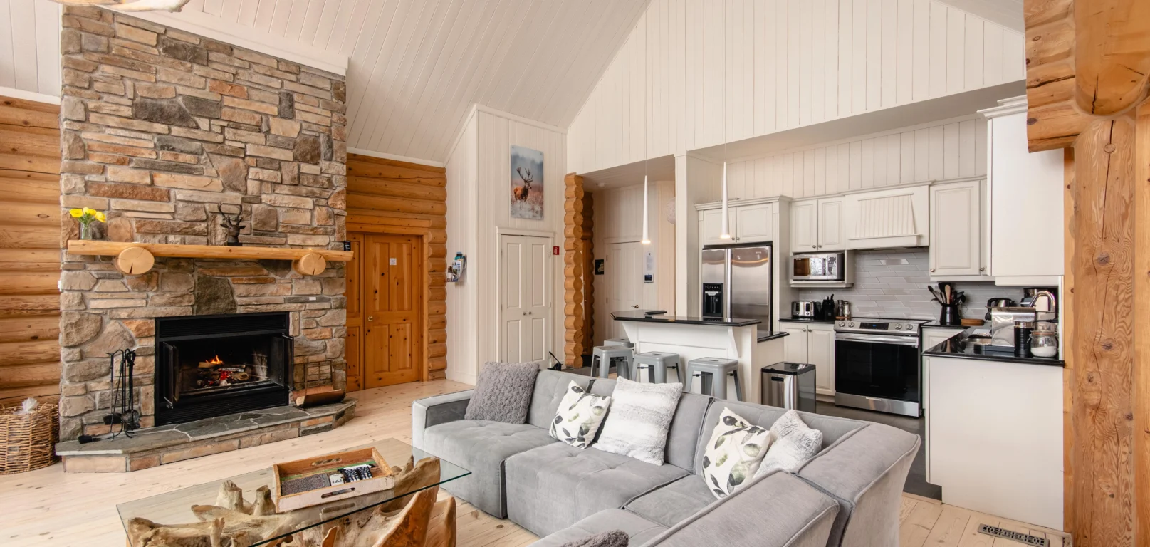 Ce chalet très spacieux comprend 5 chambres à coucher, 3 salles de bains complètes et 2 foyers au bois (un foyer par étage). Il peut loger aisément 12 adultes. La cuisine est équipée d’appareils électroménagers en acier inoxydable, incluant un lave-vaisselle et un four micro-ondes. D’autres commodités telles que la télévision par satellite, Wi-Fi haute vitesse Starlink illimité, une table de billard, une laveuse et une sécheuse sont également fournies. Un coin feu extérieur avec des chaises confortables pour relaxer est accessible durant les 3 saisons.