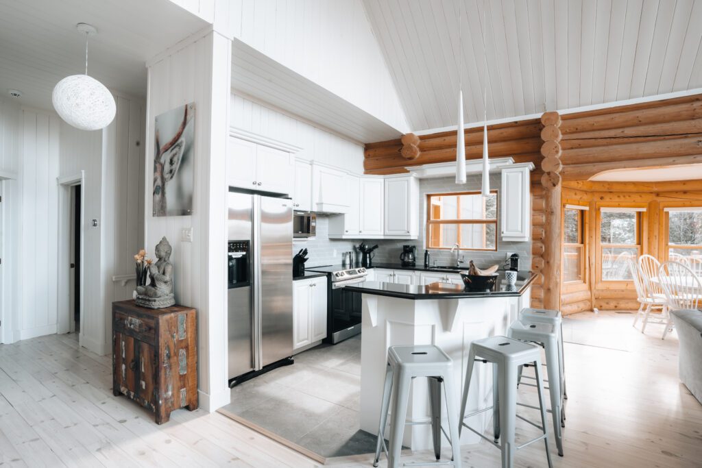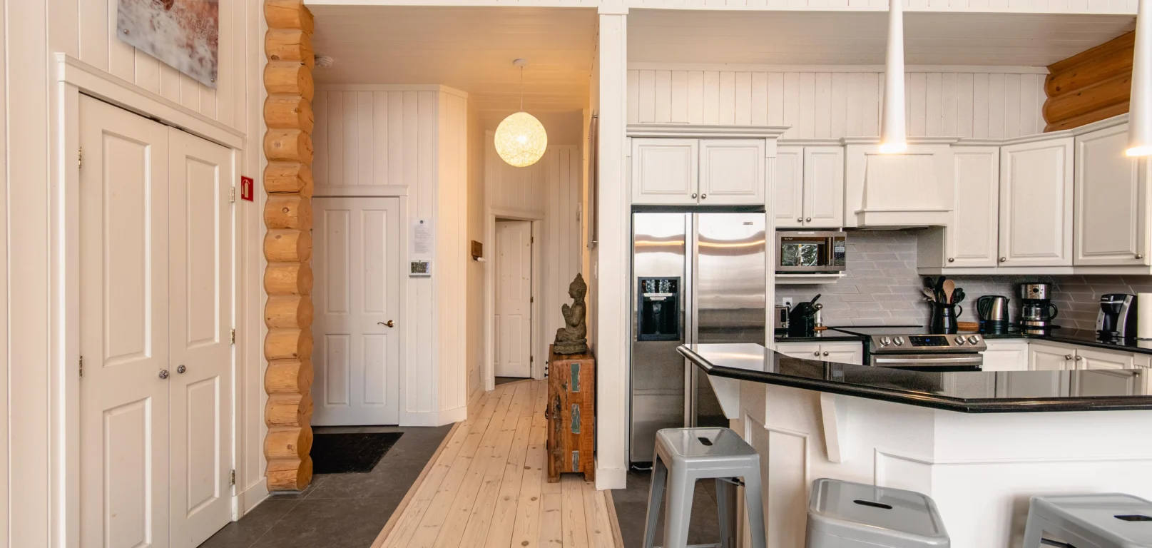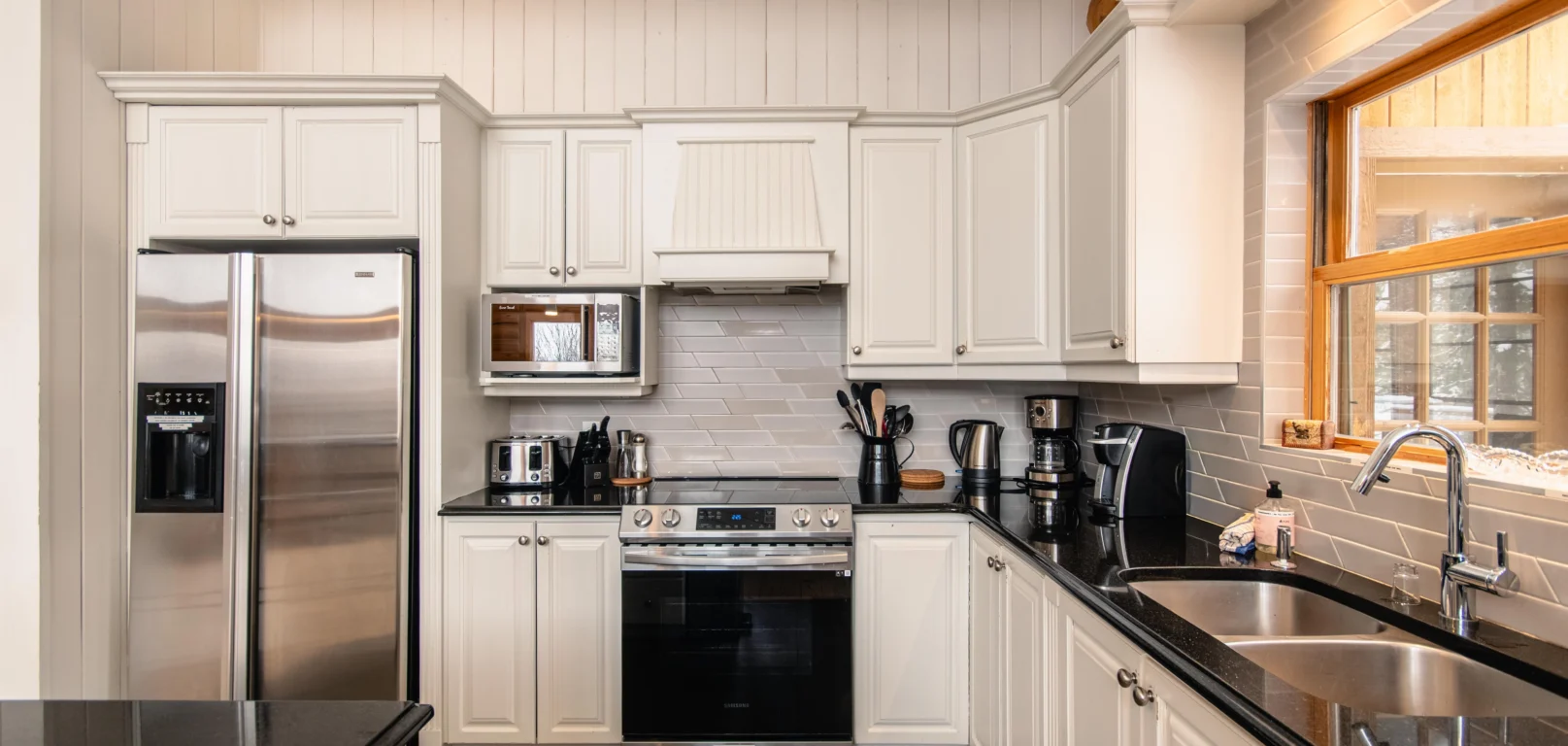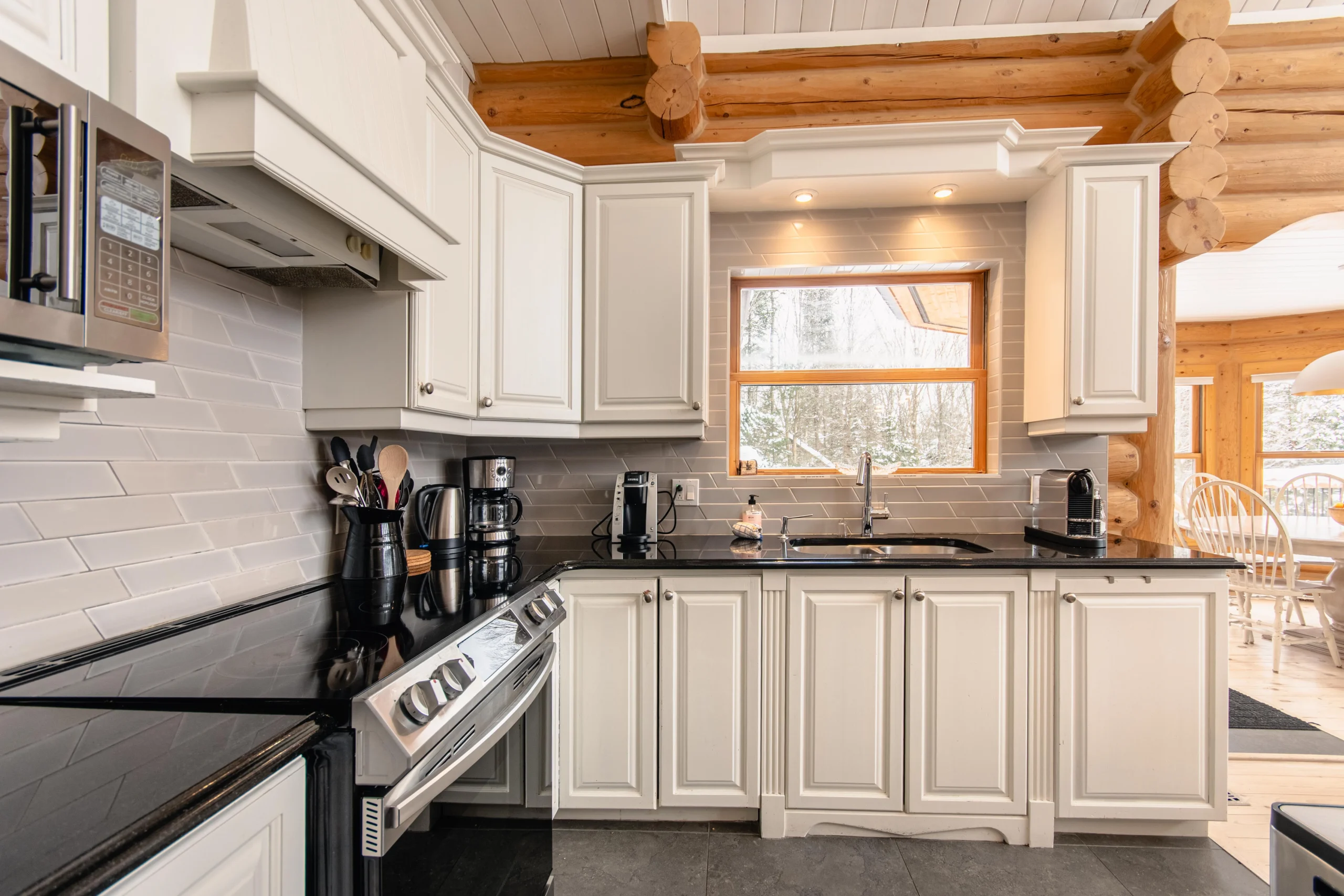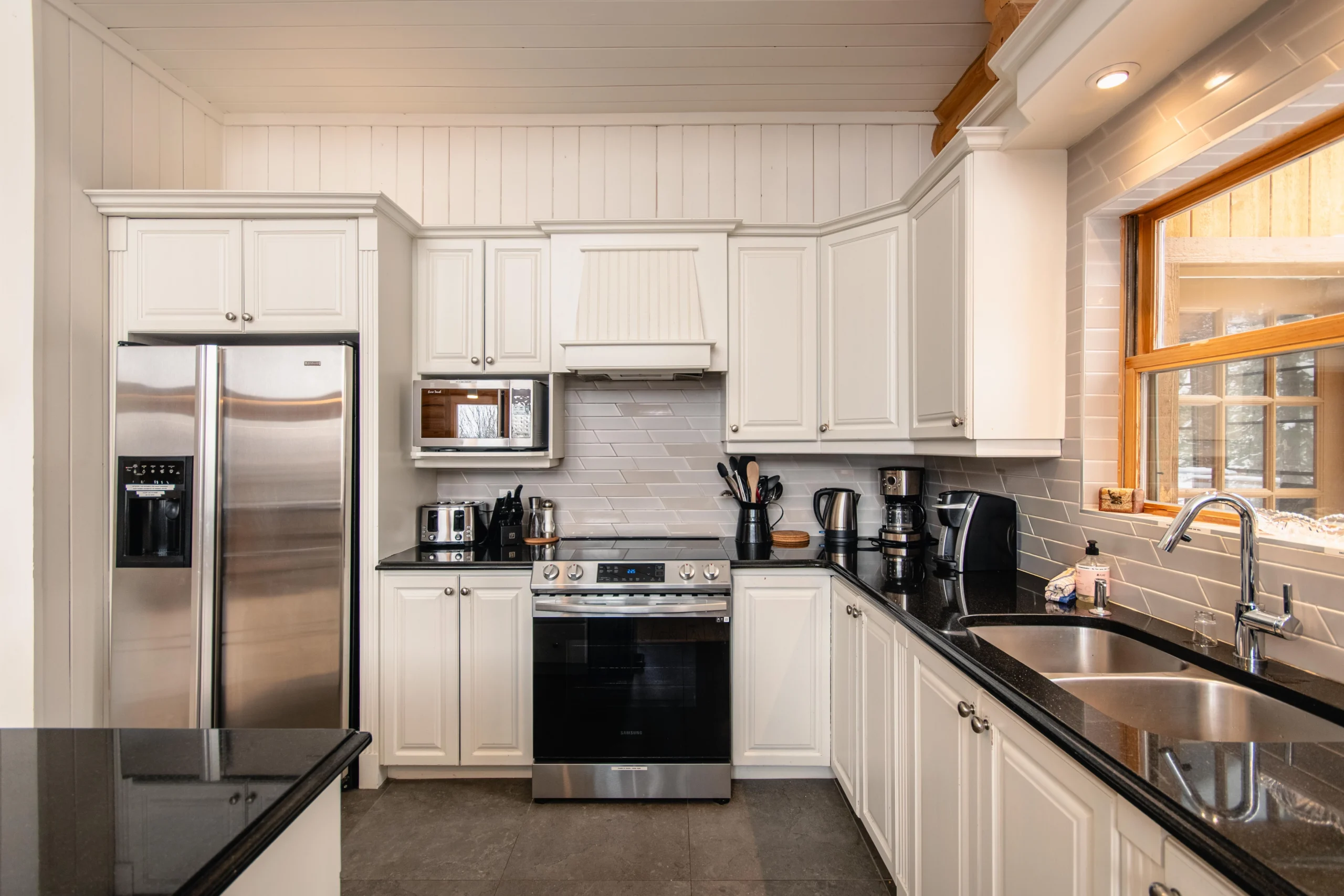 Ce chalet très spacieux comprend 5 chambres à coucher, 3 salles de bains complètes et 2 foyers au bois (un foyer par étage). Il peut loger aisément 12 adultes. La cuisine est équipée d’appareils électroménagers en acier inoxydable, incluant un lave-vaisselle et un four micro-ondes. D’autres commodités telles que la télévision par satellite, Wi-Fi haute vitesse Starlink illimité, une table de billard, une laveuse et une sécheuse sont également fournies. Un coin feu extérieur avec des chaises confortables pour relaxer est accessible durant les 3 saisons.