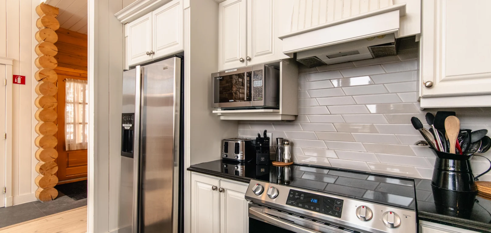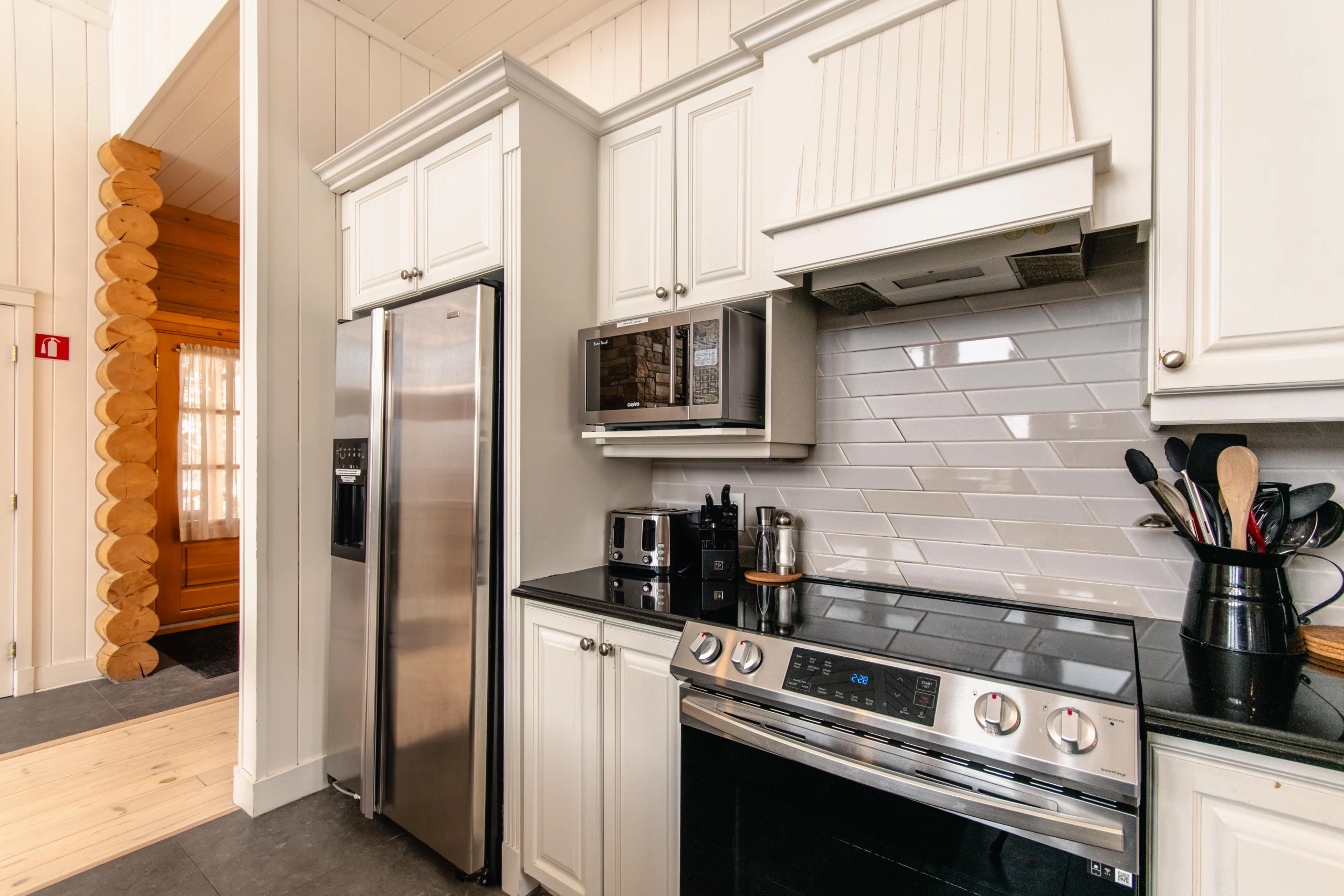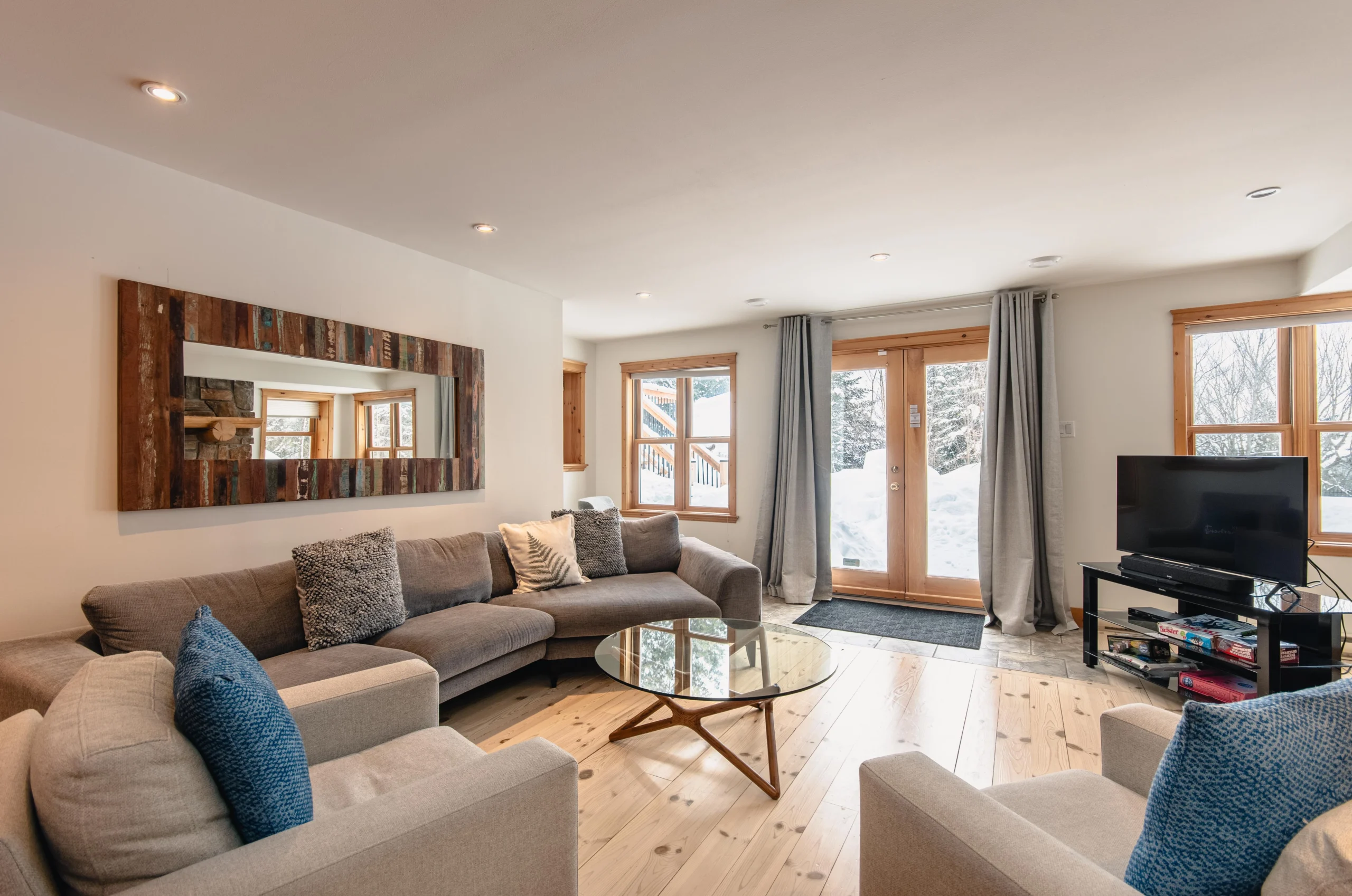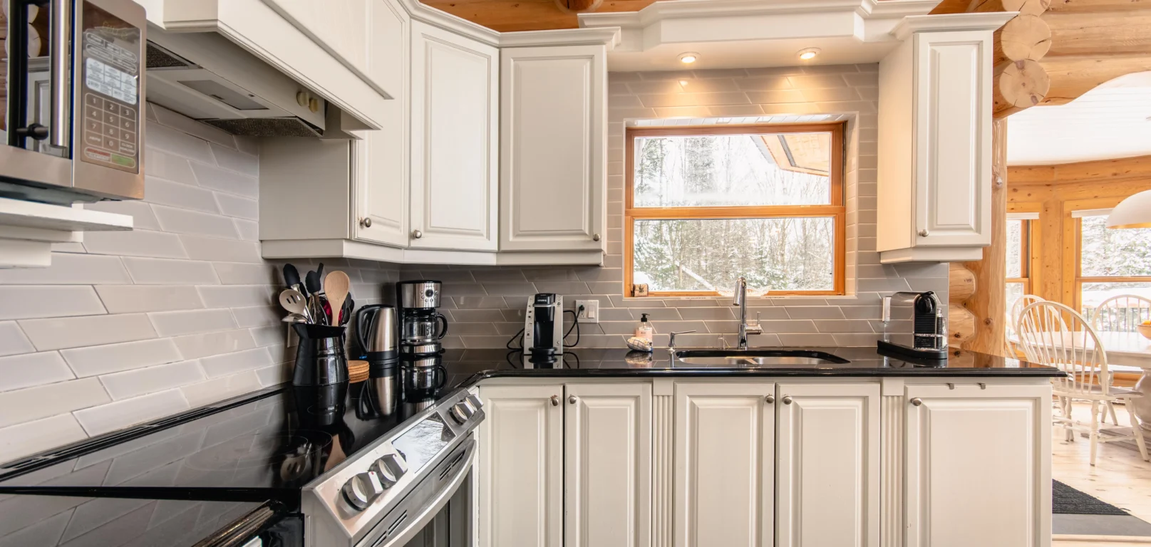 Ce chalet très spacieux comprend 5 chambres à coucher, 3 salles de bains complètes et 2 foyers au bois (un foyer par étage). Il peut loger aisément 12 adultes. La cuisine est équipée d’appareils électroménagers en acier inoxydable, incluant un lave-vaisselle et un four micro-ondes. D’autres commodités telles que la télévision par satellite, Wi-Fi haute vitesse Starlink illimité, une table de billard, une laveuse et une sécheuse sont également fournies. Un coin feu extérieur avec des chaises confortables pour relaxer est accessible durant les 3 saisons.