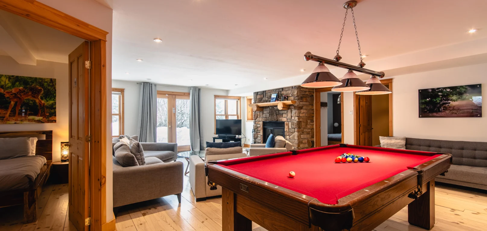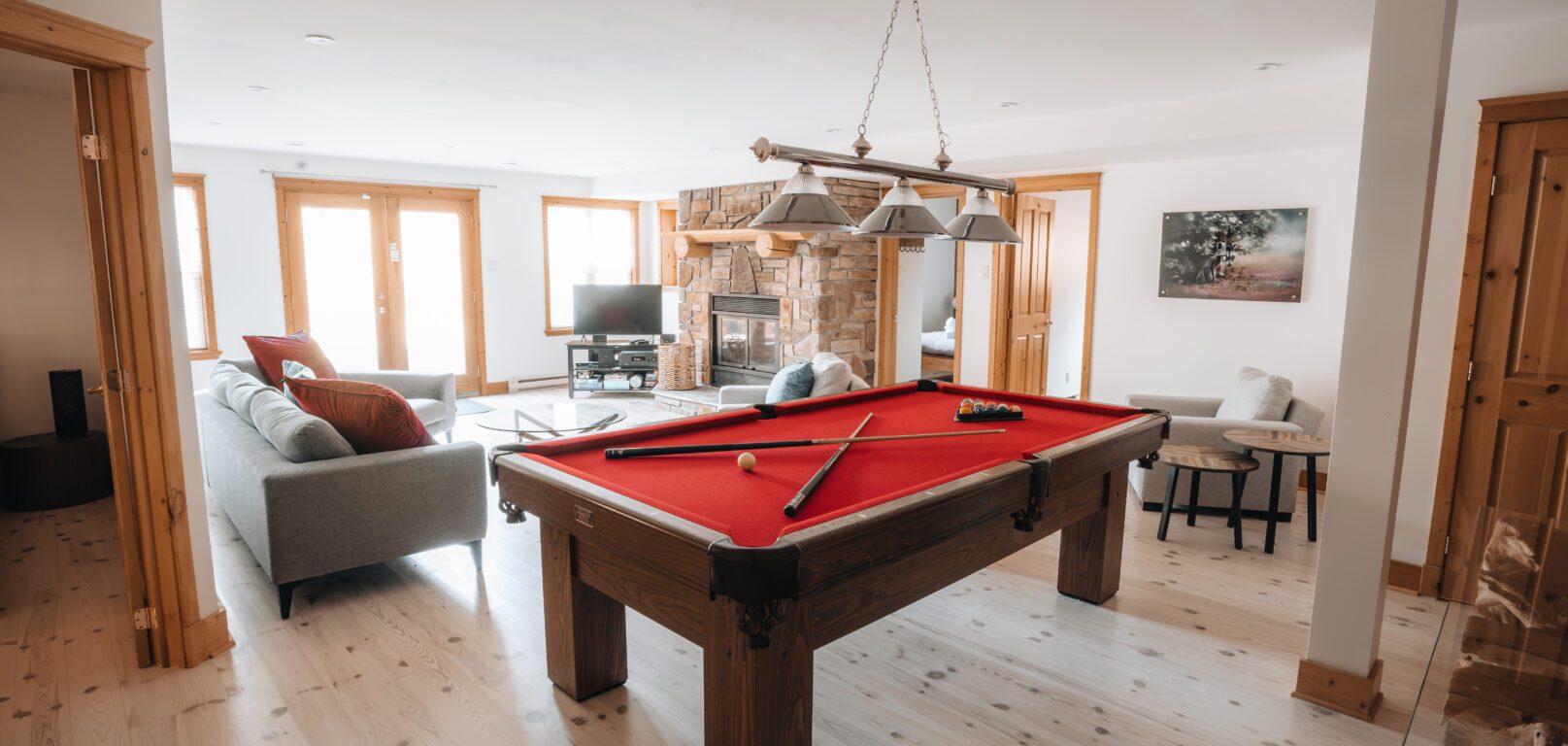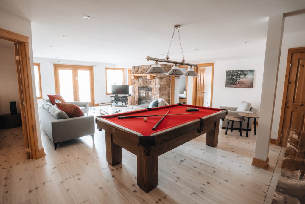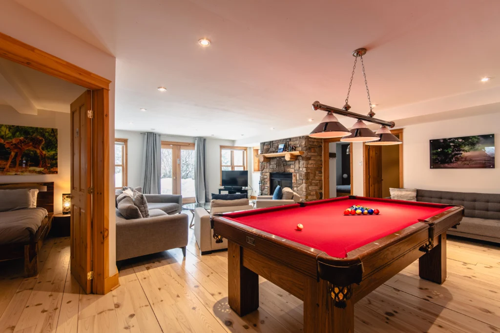 - Une grande salle de jeu avec table de billard et foyer au bois