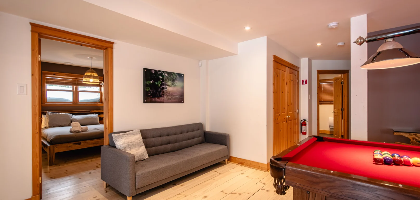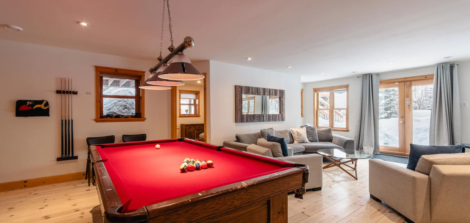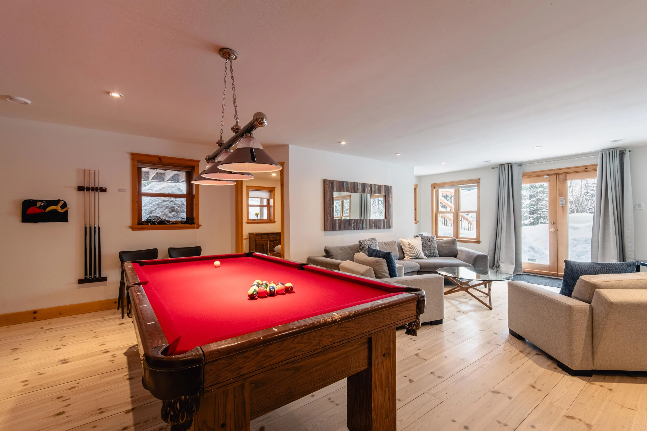 - Une grande salle de jeu avec table de billard et foyer au bois