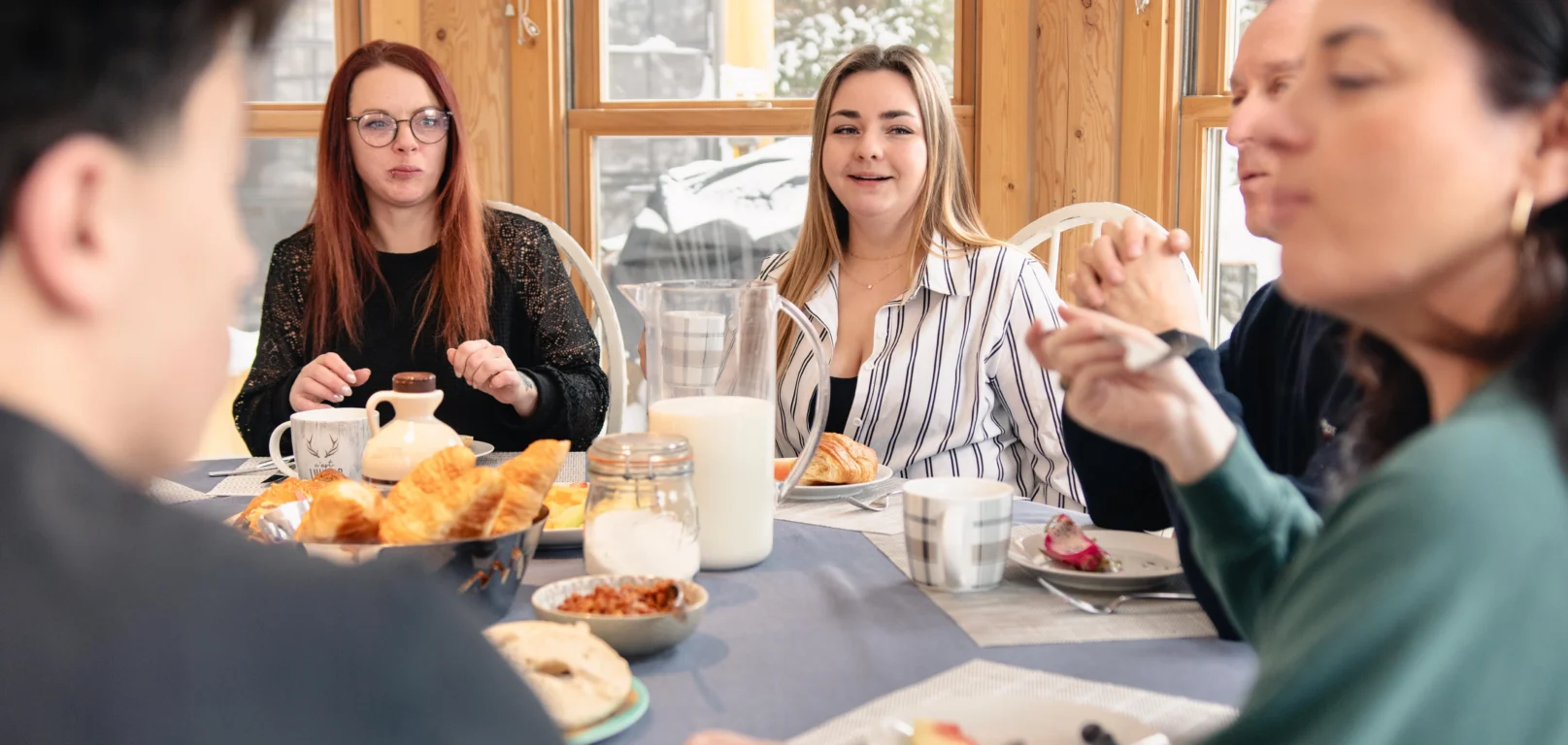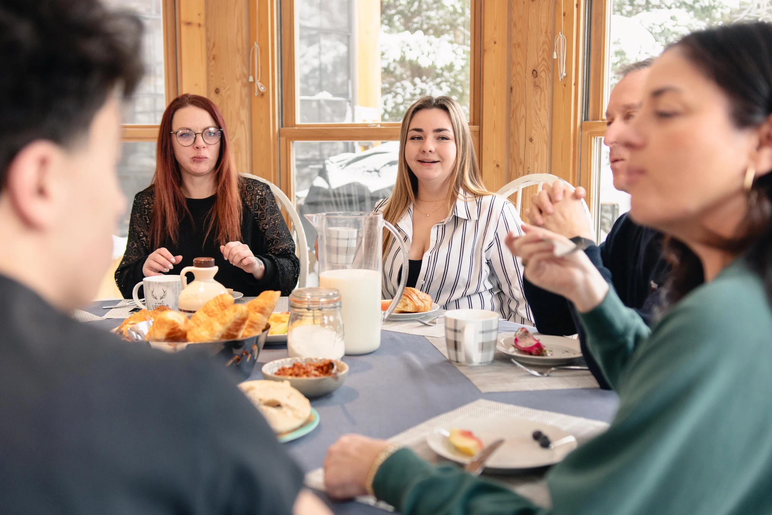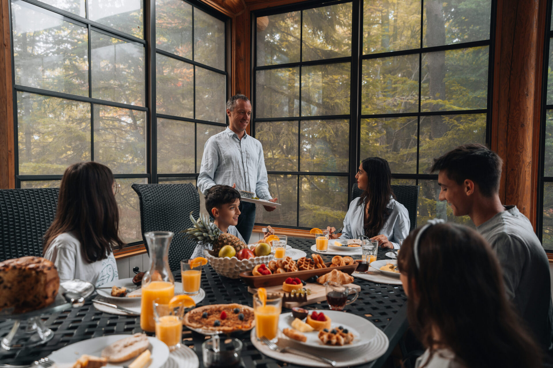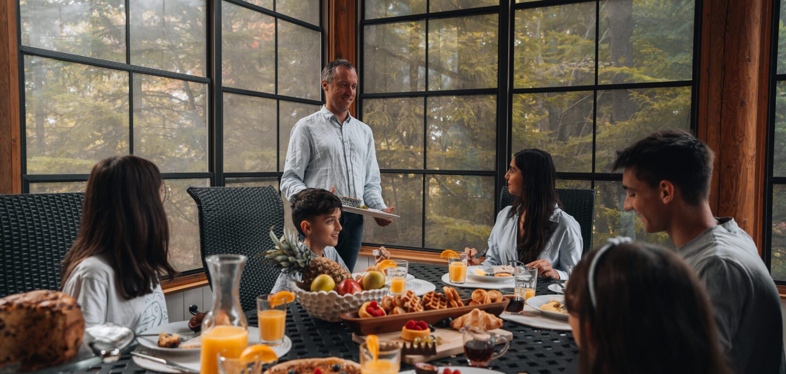 - une salle à manger avec une grande table à manger arrondie, dans une pièce entièrement vitrée sur la forêt environnante
