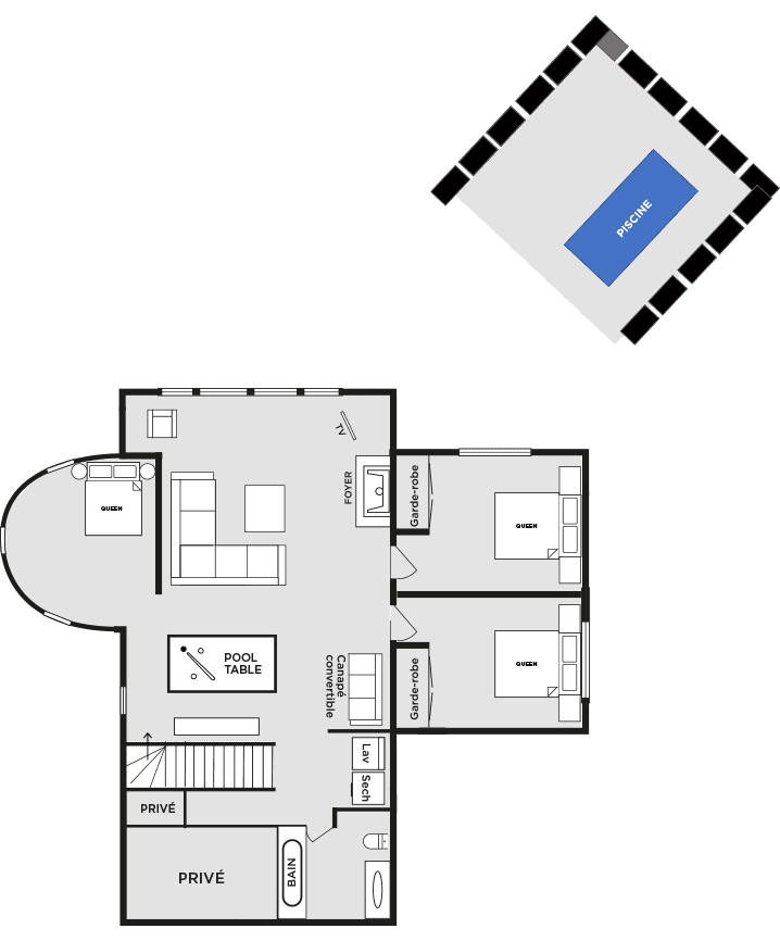 - 3 chambres avec 1 lit Queen chacune