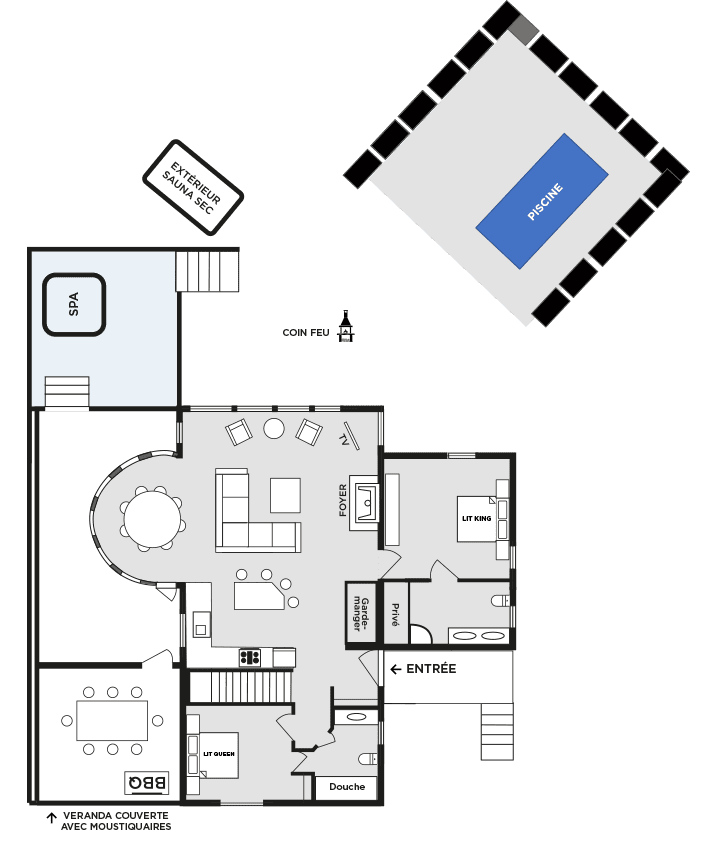 - Serviettes de toilette fournies (apportez vos serviettes pour la baignade et le spa)