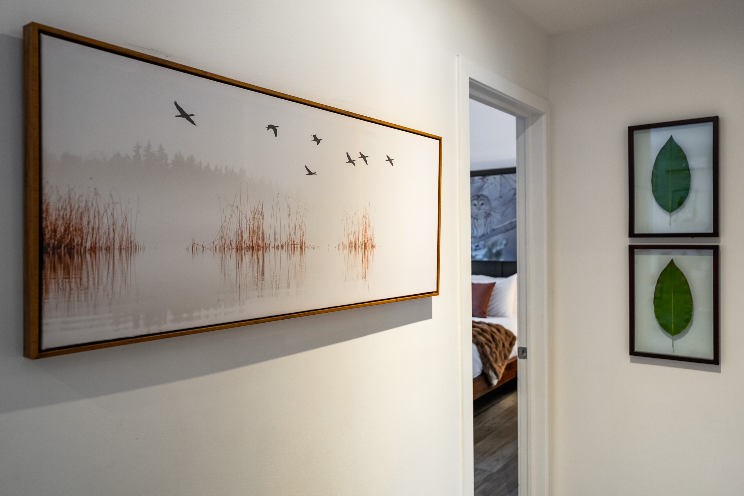 From the large garden-level patio door, you have direct access to the hot tub, outdoor dry sauna, and cozy firepit. Just a few steps down, a private dock invites you to unwind and soak in the peaceful lake views. For gentle exploration of the shoreline, a canoe, kayaks, a pedal boat and paddleboard are at your disposal.