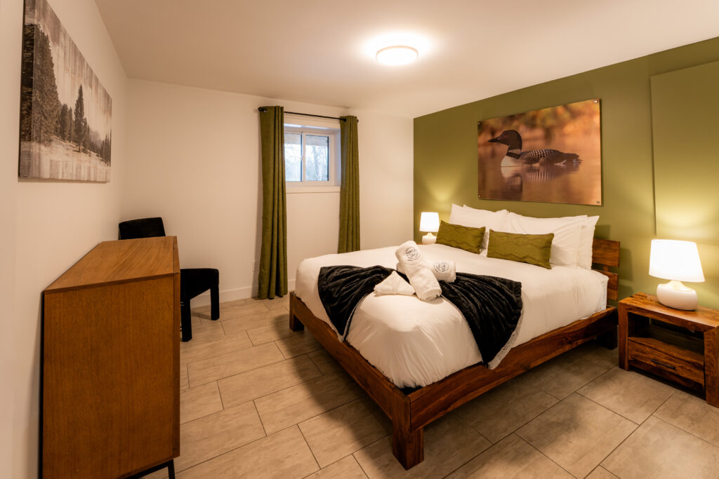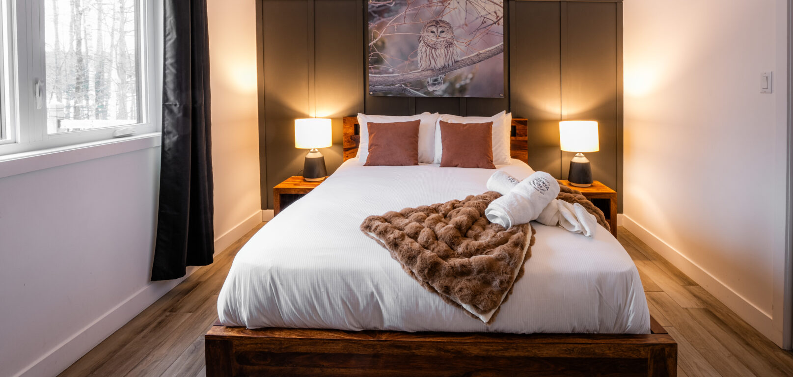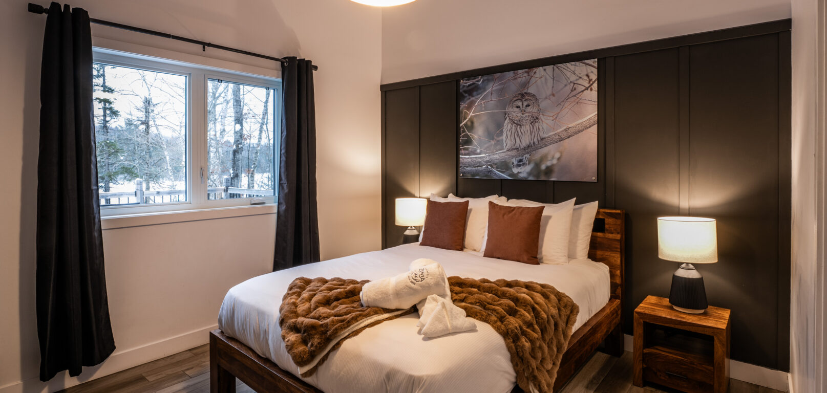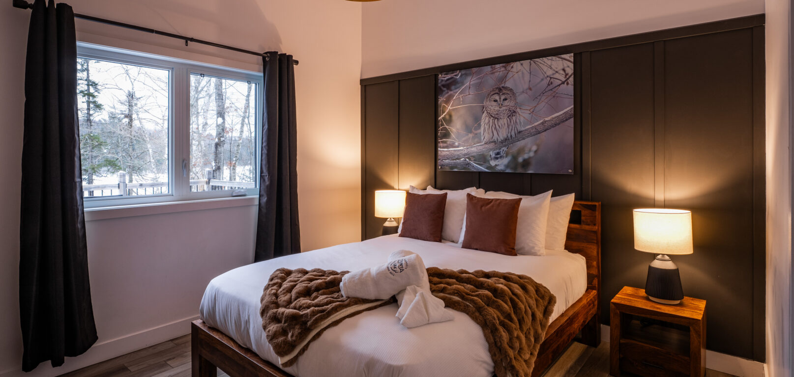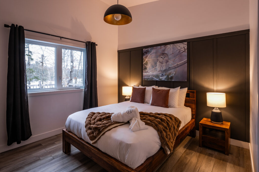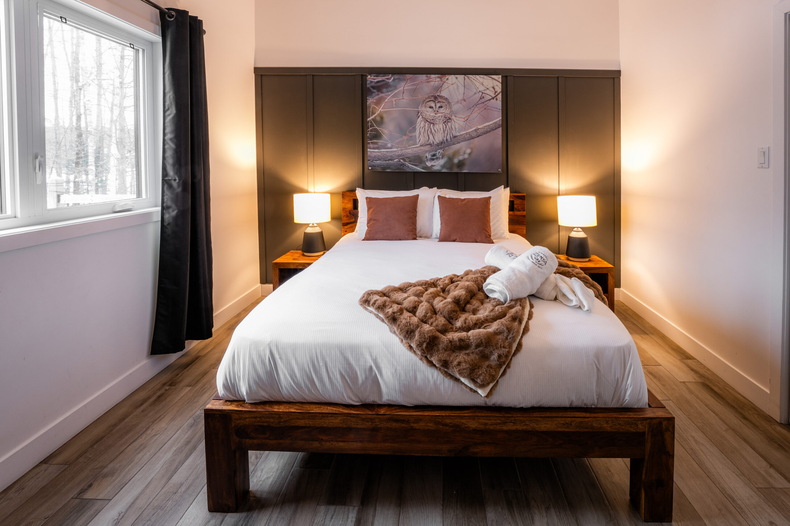 Spread over two floors, Chalet Serenia features 4 bedrooms, 3 bathrooms, a large play room, and can comfortably accommodate up to 10 guests. The outdoor spa and dry sauna are available year-round, and from May to October, a private dock gives you access to 2 kayaks, a paddleboard, and a pedal boat.