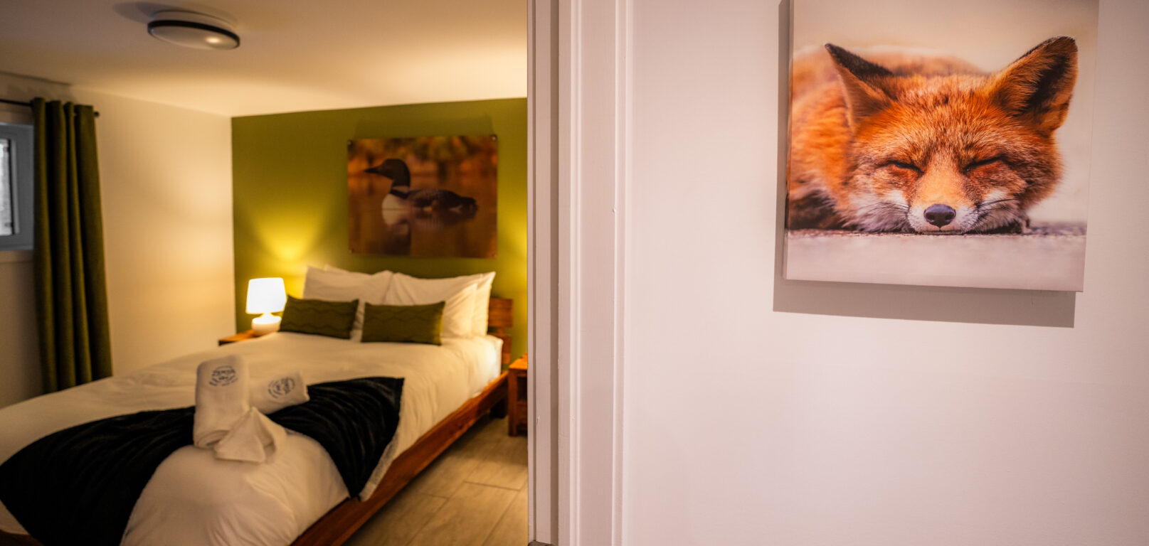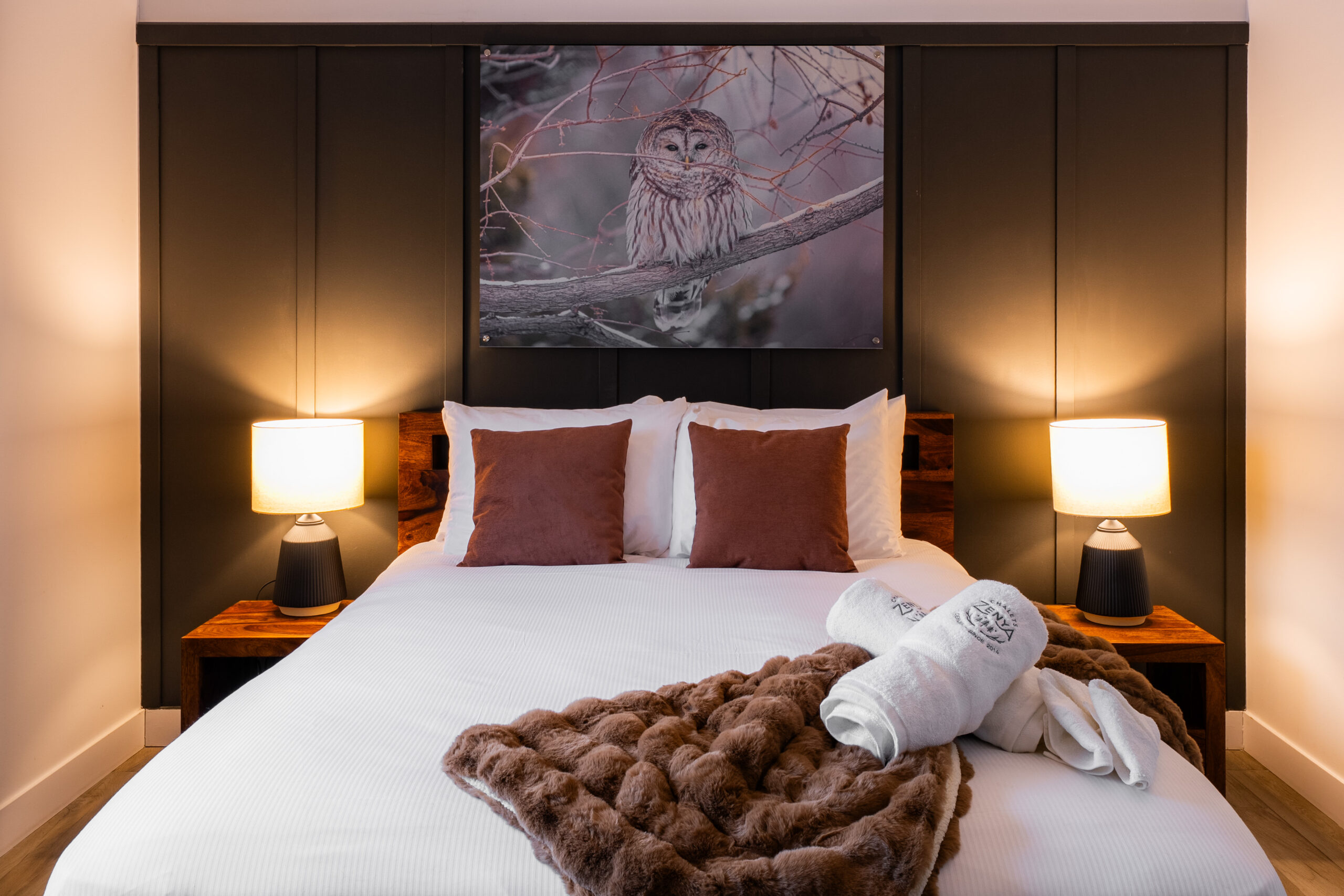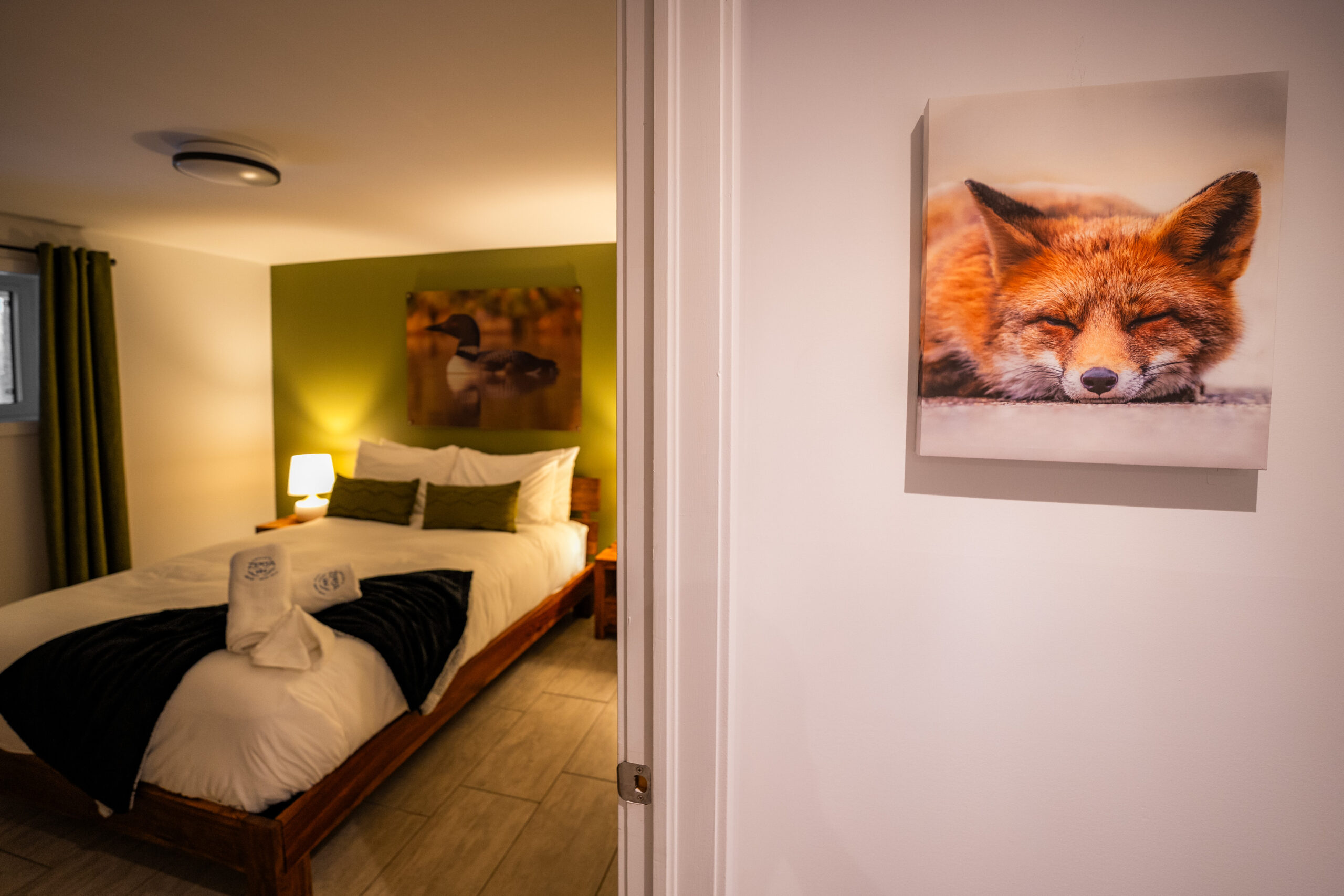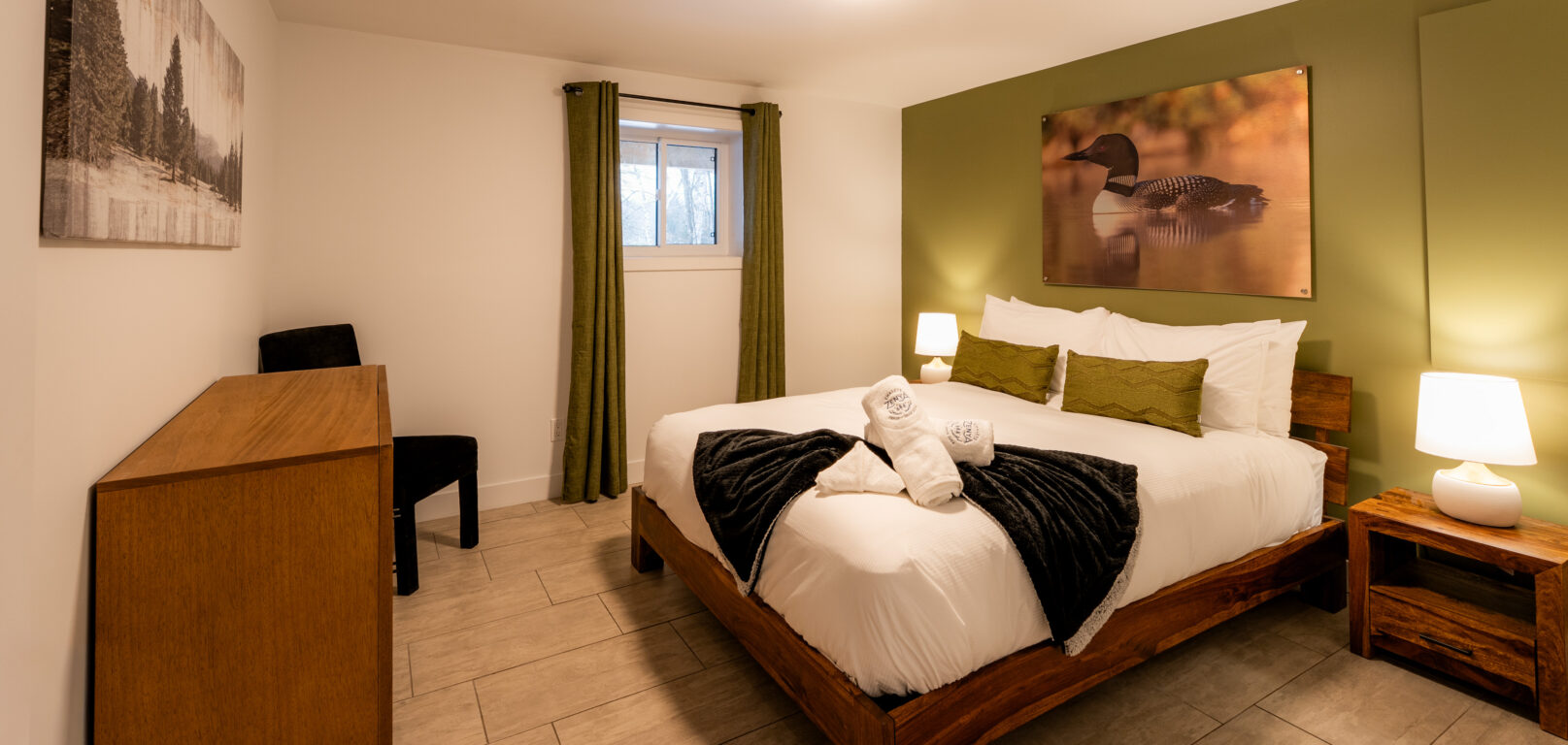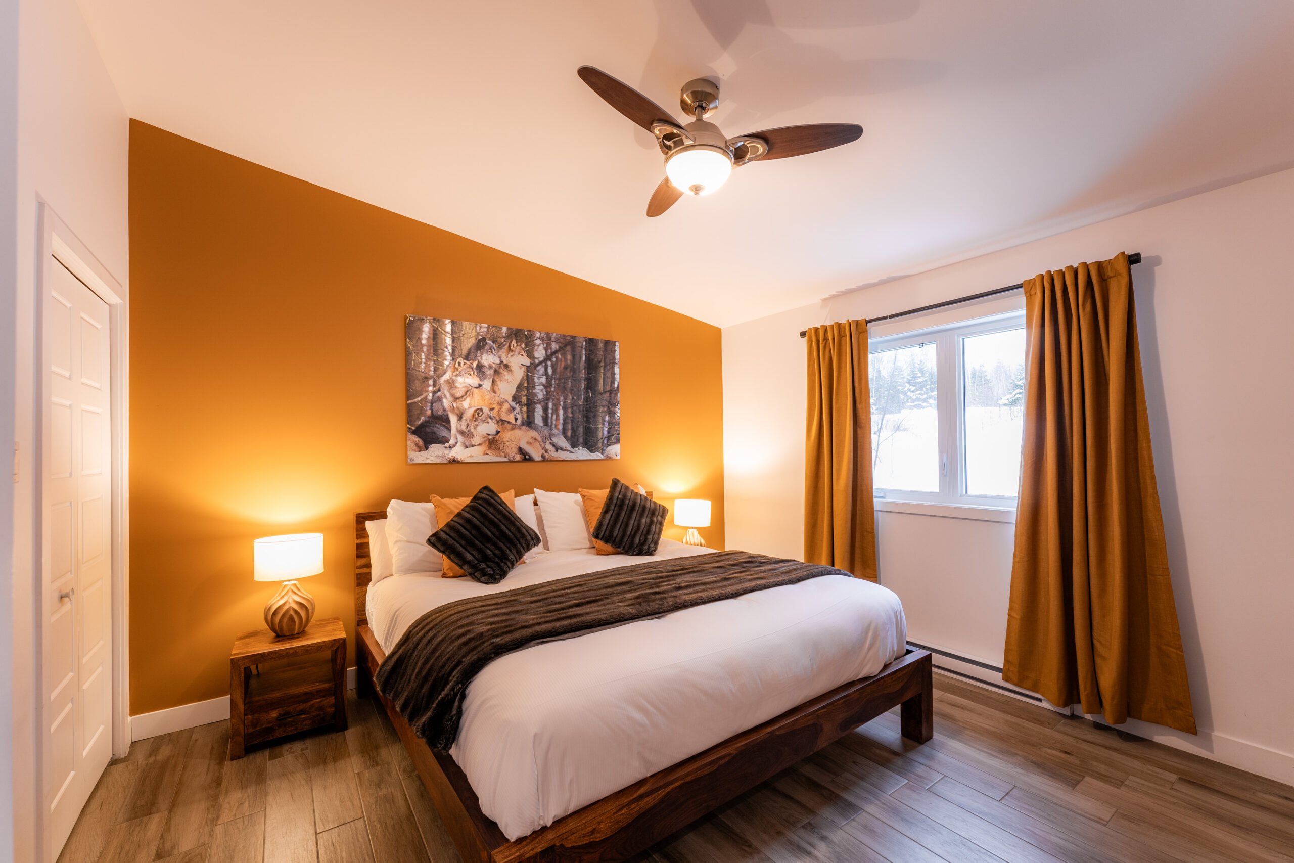 Spread over two floors, Chalet Serenia features 4 bedrooms, 3 bathrooms, a large play room, and can comfortably accommodate up to 10 guests. The outdoor spa and dry sauna are available year-round, and from May to October, a private dock gives you access to 2 kayaks, a paddleboard, and a pedal boat.