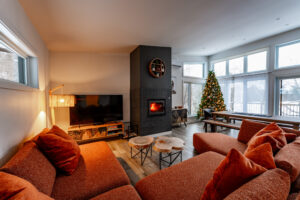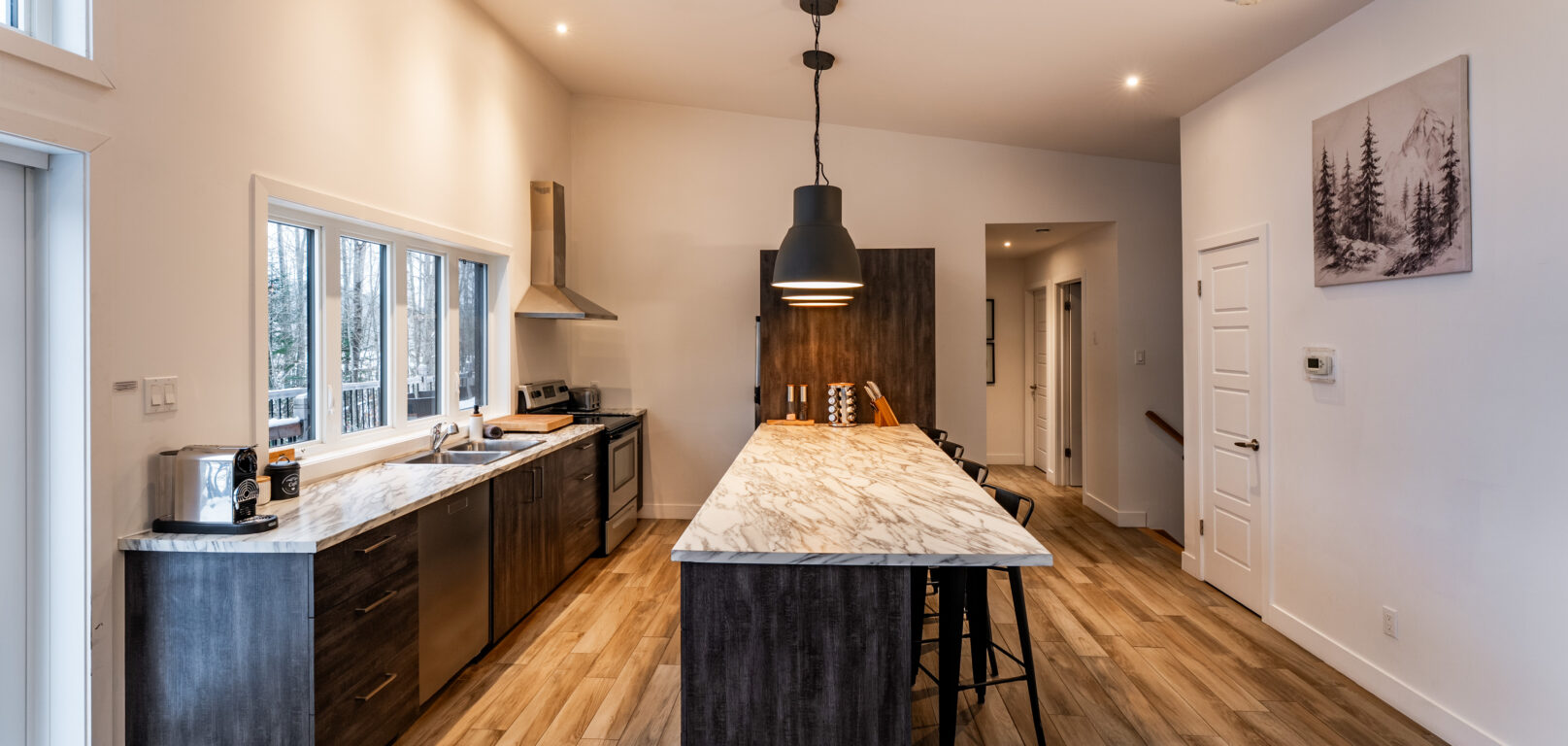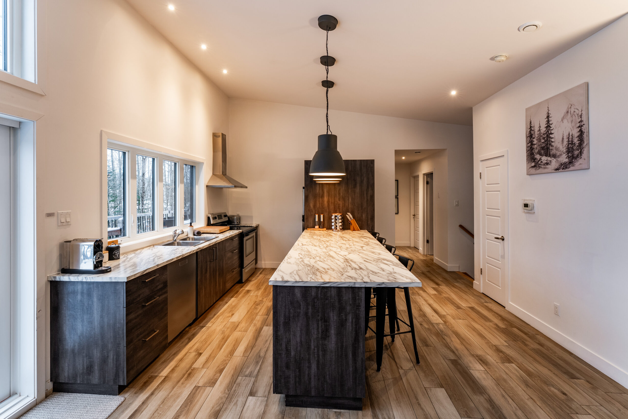 The chalet’s entrance is on the upper level. Upon arrival, you’ll find a convenient mudroom just off the entryway. The fully equipped kitchen, featuring a large central island, combines elegance and practicality with its high-end appliances: refrigerator, stove, oven, dishwasher, microwave, coffee maker, and toaster. The spacious, light-filled dining area comfortably seats up to eight guests in a welcoming atmosphere.