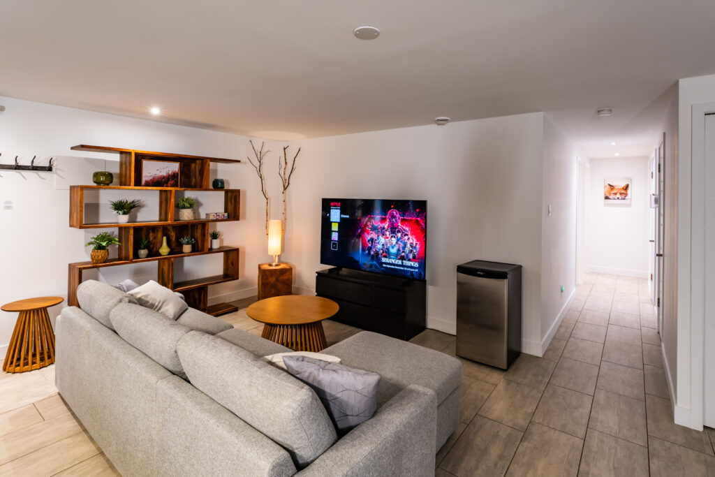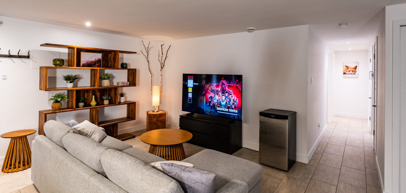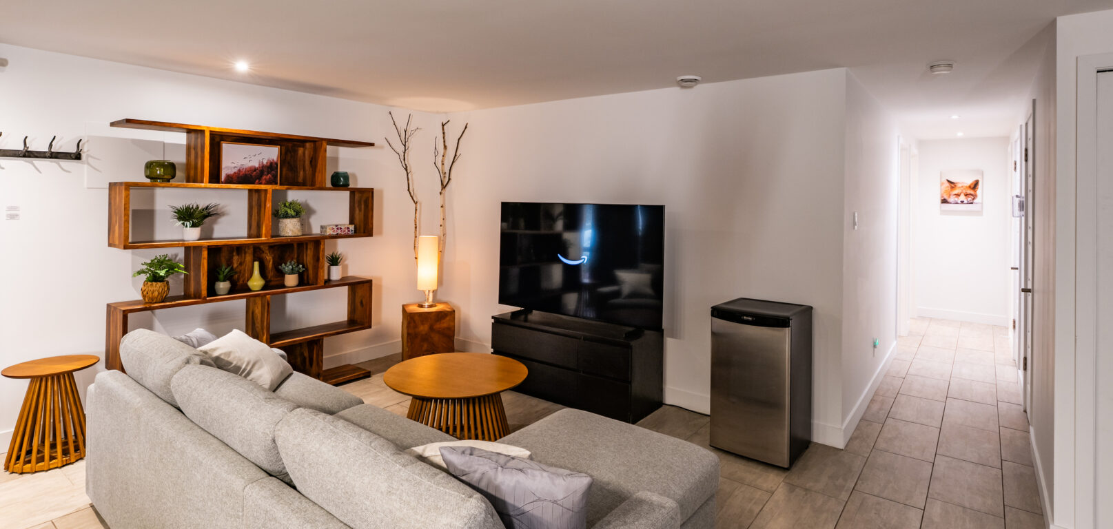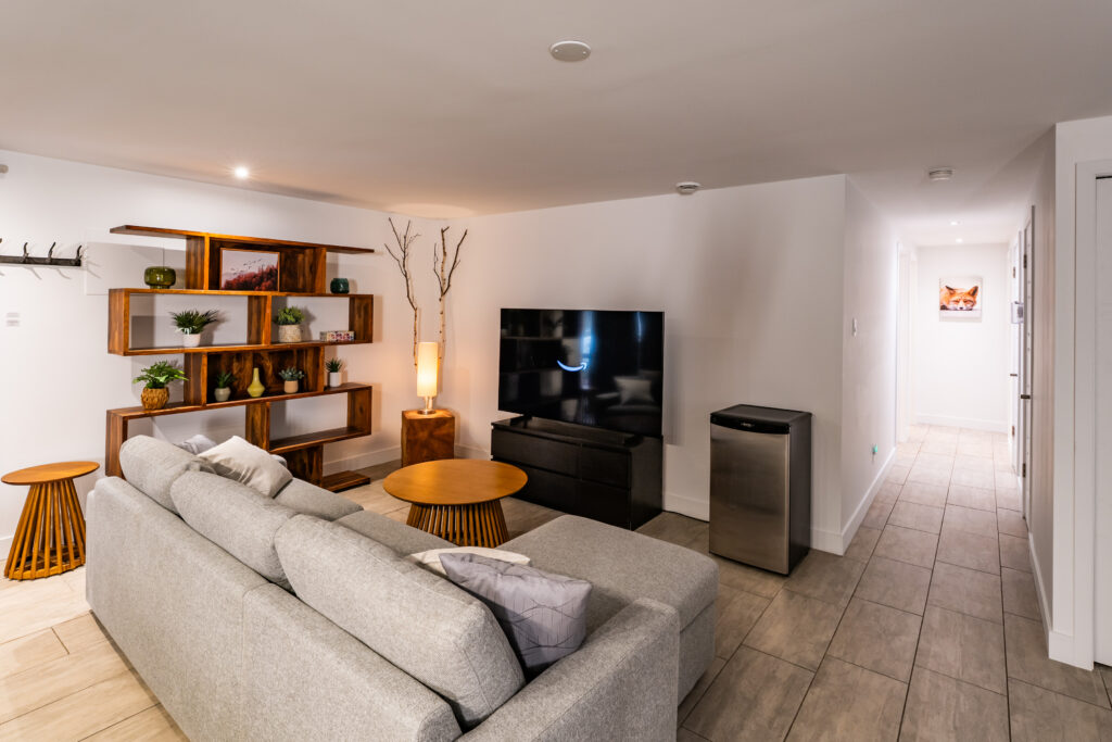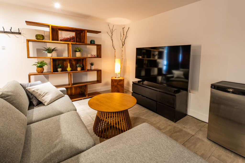 The main living room is tastefully designed and generously sized, inviting you to unwind with its plush sofas, wood fireplace, elegant armchairs, and large flat-screen TV and an indoor fireplace. Also on this level, the master bedroom features a king-size bed and ample storage space—ensuring absolute comfort and its own en-suite bathroom. Next to it, another spacious bedroom with an en-suite bathroom and queen size bed. Each bathroom is equipped with a sleek design with a walk-in shower, modern vanity, and toilet.