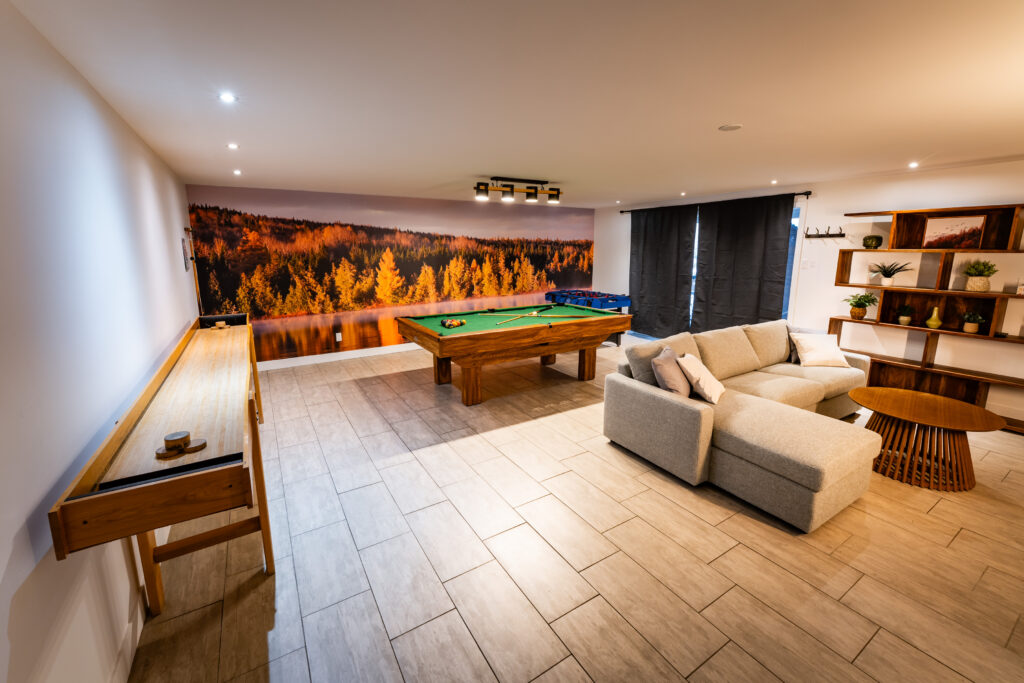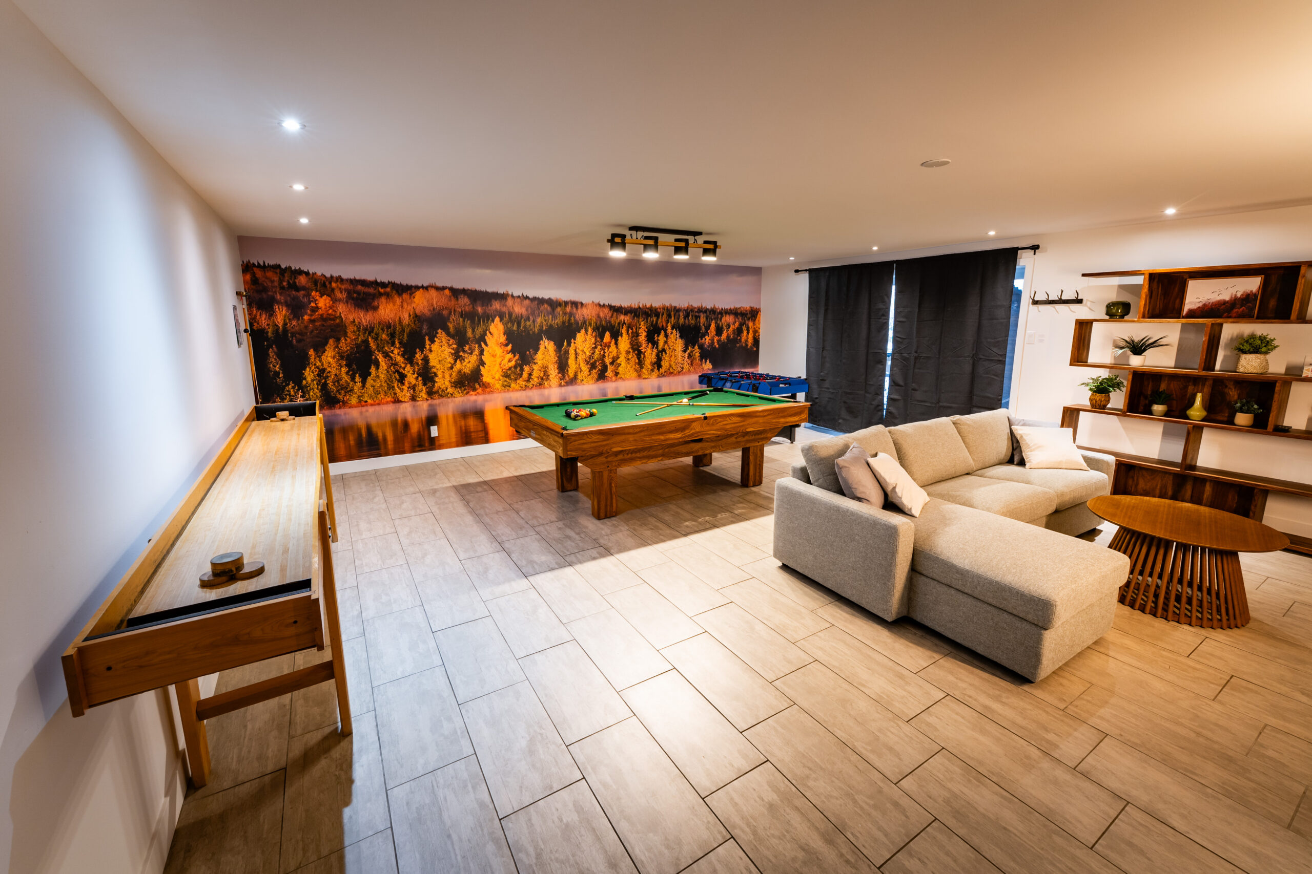 On the garden level, a second living room offers a playful space with a pool table convertible into a ping pong table, a Mississipi game table, a foosball table and a wide selection of board games—perfect for lively evenings with family or friends. Two additional bedrooms, each furnished with a queen-size bed, are tastefully appointed. A third bathroom on this floor includes a shower, vanity, and toilet.