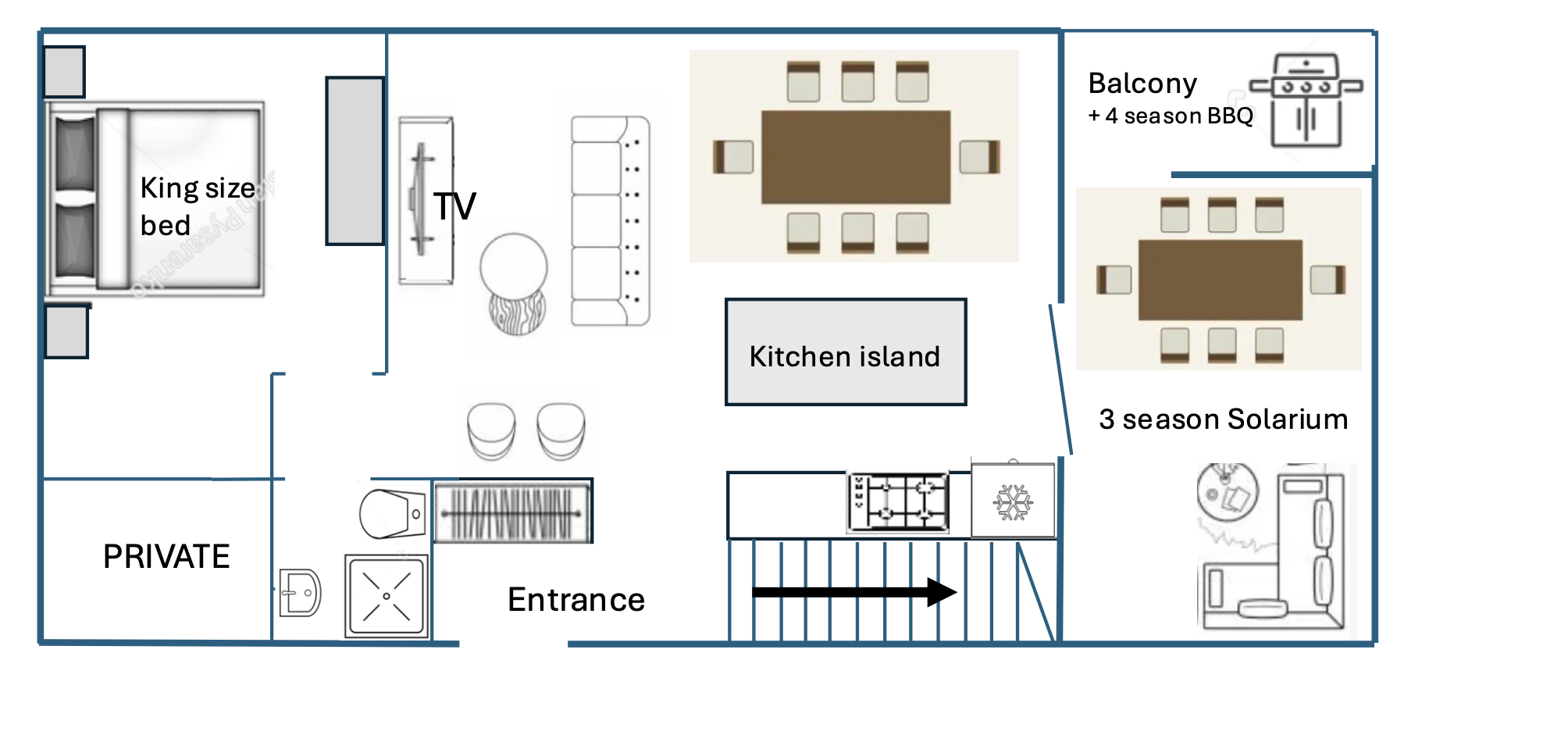 - Propane barbecue functional year-round with 3 spare bottles