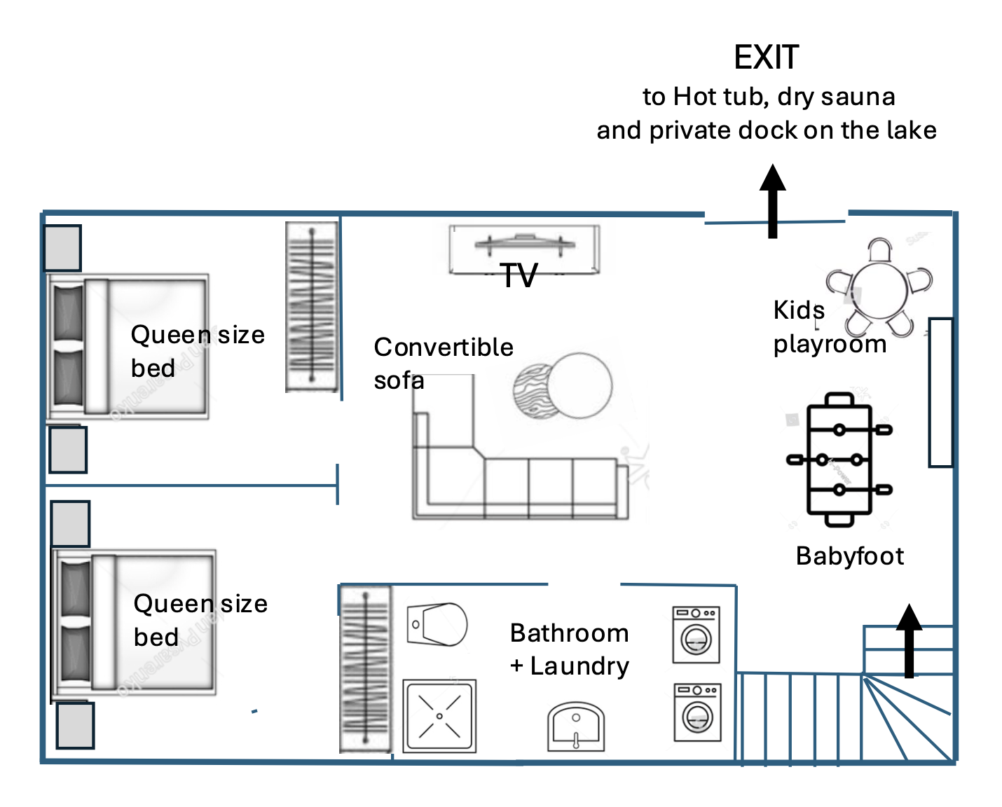 - Bedroom 2: a bedroom with Queen bed downstairs