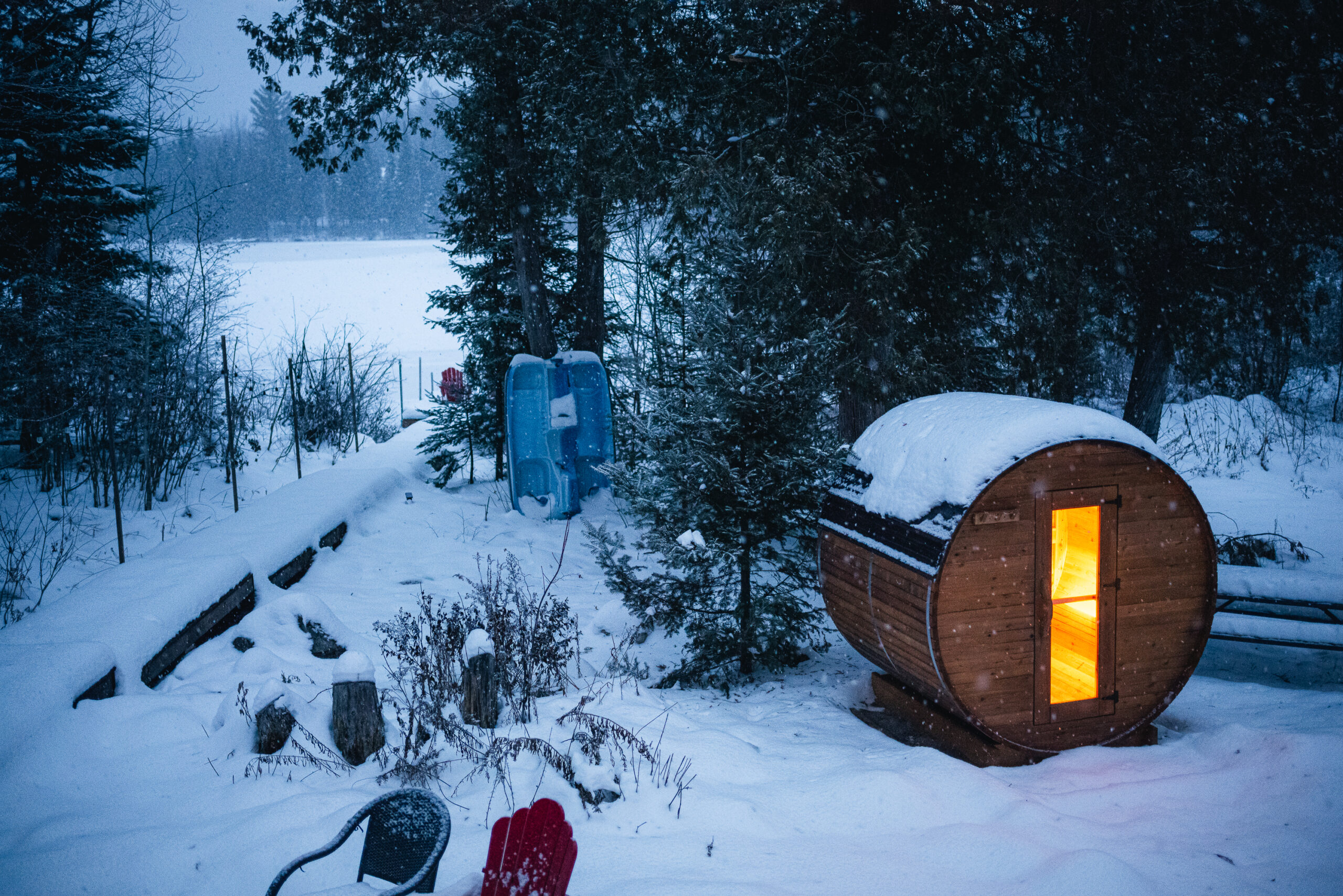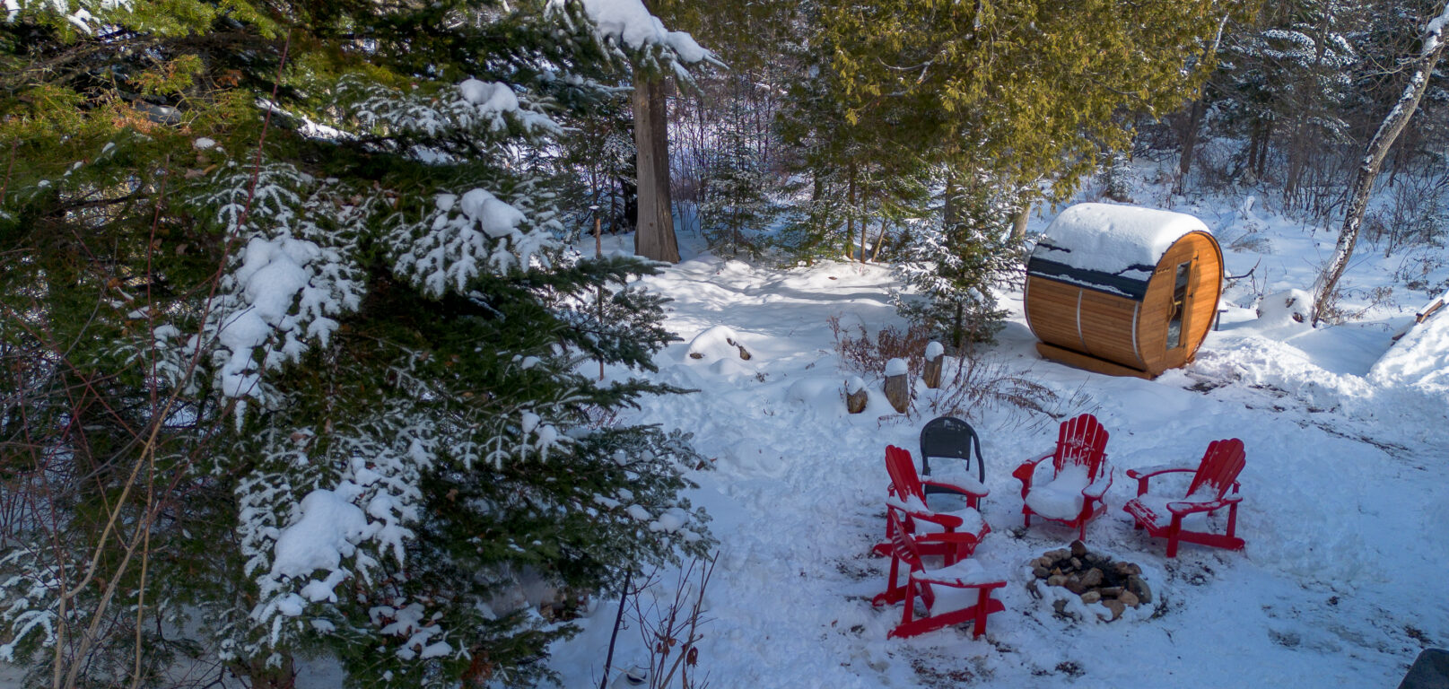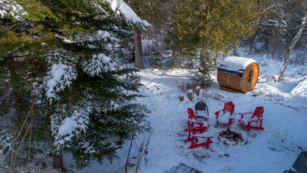 The back door of the cottage opens onto a charming backyard featuring an outdoor fireplace (firewood provided — just bring your own newspaper and kindling), a 6-person spa, and a dry sauna for 4 persons, all accessible year-round. Upstairs, the 3-season screened veranda serves as a summer dining space for 8–10 guests, while a propane gas BBQ is available and functional throughout the year.