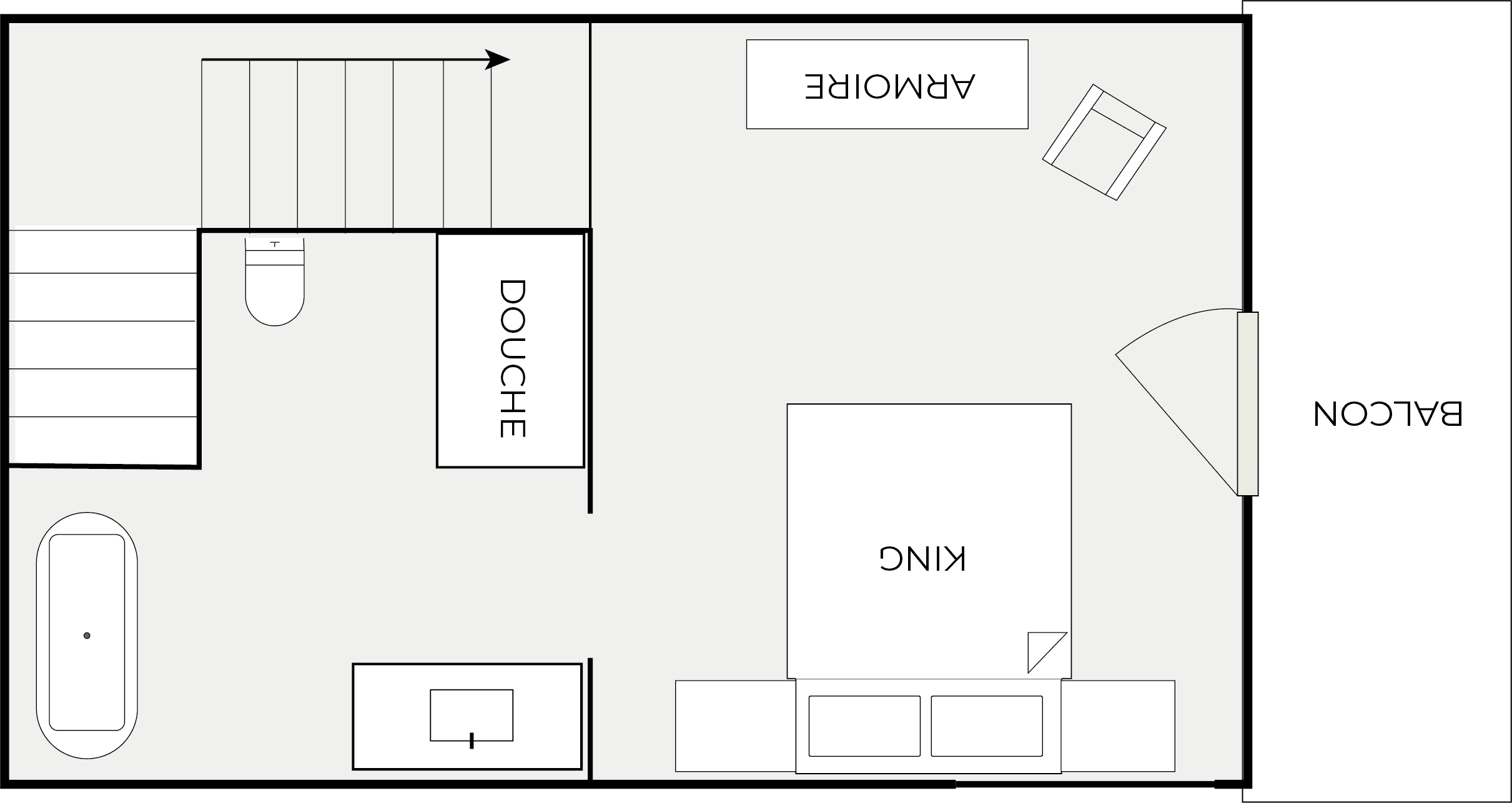 - Bedroom 2: large closed bedroom with a King size bed and on the mezzanine, a suspended Queen bed